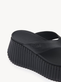 Crafted from calfskin, these Nama wedge slides feature a thong front debossed with the Chloe logo. They are set on an iconic, lightweight and ultra-comfortable recycled platform, finished with immaculate tonal blanket stitching which takes 4.5 hours to complete by hand. PRODUCT DETAILS Wedge slide heel height: 8 cm (3.1") Heel-to-toe drop: 4.5 cm (1.8") Upper: calfskin Inner sole: calfskin Main lining: calfskin Sole: 50% rubber, 50% EVA Fit true to size, European sizing - Slip-on To make this product, Chloe worked with Leather Working Group (LWG) certified leather manufacturers. LWG certifies tanneries based on their water and energy usage, management of chemicals, solid waste, and wastewater. Colour: Black Item code: CHC25A10XSN9FB