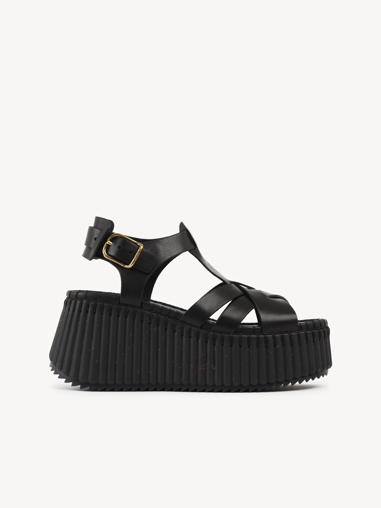 Rooted in the Maison's commitment to sustainability, the iconic Nama line includes these lower-impact wedge sandals. Crafted from smooth cowhide and a mix of lower-impact materials, they are the perfect hybrid piece. Set on a chunky ridged sole, the upper features interwoven straps combined with tonal stitching. These ultra-comfortable wedge platform sandals are finished with a Chloe-engraved gold-tone buckle for an adjustable fit. PRODUCT DETAILS Wedge heel height: 3.1" (8 cm) Heel-to-toe drop: 1.8" (4.5 cm) Upper: smooth cowhide Inner sole: ethylene vinyl acetate Main lining: cowhide Secondary lining: cowhide Sole: 50% ethylene vinyl acetate, 50% rubber Fit true to size, European fit - Adjustable strap - Buckle fastening To make this product, Chloe worked with Leather Working Group (LWG) certified leather manufacturers. LWG certifies tanneries based on their water and energy usage, management of chemicals, solid waste, and wastewater. Color: Black Item code: CHC24A05DNC001