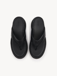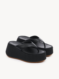 Crafted from calfskin, these Nama wedge slides feature a thong front debossed with the Chloe logo. They are set on an iconic, lightweight and ultra-comfortable recycled platform, finished with immaculate tonal blanket stitching which takes 4.5 hours to complete by hand. PRODUCT DETAILS Wedge slide heel height: 3.1" (8 cm) Heel-to-toe drop: 1.8" (4.5 cm) Upper: calfskin Inner sole: calfskin Main lining: calfskin Sole: 50% rubber, 50% EVA Fit true to size, European sizing - Slip-on To make this product, Chloe worked with Leather Working Group (LWG) certified leather manufacturers. LWG certifies tanneries based on their water and energy usage, management of chemicals, solid waste, and wastewater. Color: Black Item code: CHC25A10XSN001