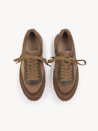Crafted from a mix of suede cowhide and crackled sheepskin, these Nama sneakers are set on an iconic, lightweight and ultra-comfortable recycled sole with a speckled effect. They are finished with immaculate blanket stitching which takes 4.5 hours to complete by hand. Chloe logo embroidery signs the back and tongue. PRODUCT DETAILS Sneaker heel height: 2" (5 cm) Heel-to-toe drop: 0.8" (2 cm) Upper: 80% cowhide, 20% sheepskin Inner sole: calfskin Main lining: polyester Sole: 50% ethylene vinyl acetate, 50% rubber Fit true to size, European sizing - Lace-up To make this product, Chloe worked with Leather Working Group (LWG) certified leather manufacturers. LWG certifies tanneries based on their water and energy usage, management of chemicals, solid waste, and wastewater. Color: Oak Brown Item code: CH25W00RTV23O