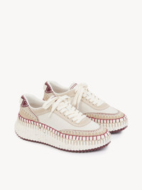 Crafted from a mix of smooth and suede cowhide, these Nama sneakers are set on an iconic, lightweight and ultra-comfortable recycled sole with a speckled effect. They are finished with immaculate blanket stitching which takes 4.5 hours to complete by hand. Chloe logo embroidery signs the back and tongue. PRODUCT DETAILS Sneaker heel height: 2" (5 cm) Heel-to-toe drop: 0.8" (2 cm) Upper 1: cowhide Upper 2: suede cowhide Upper 3: polyester Upper 4: polyester Inner sole: ethylene vinyl acetate Main lining: 95% polyester, 5% elastane Secondary lining: calfskin Sole: 50% ethylene vinyl acetate, 50% rubber Fit true to size, European sizing - Lace-up To make this product, Chloe worked with Leather Working Group (LWG) certified leather manufacturers. LWG certifies tanneries based on their water and energy usage, management of chemicals, solid waste, and wastewater. Color: Beige - Purple Item code: CHC24A00RMS95U
