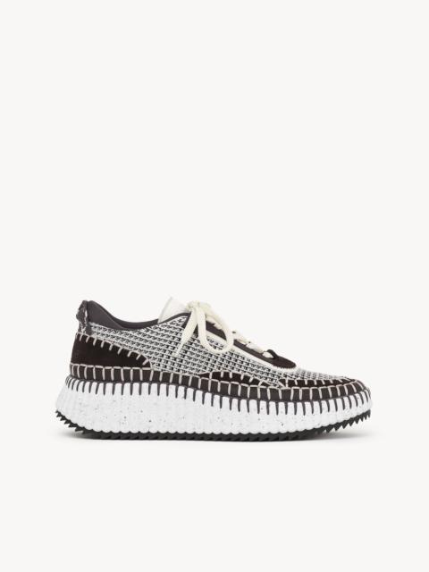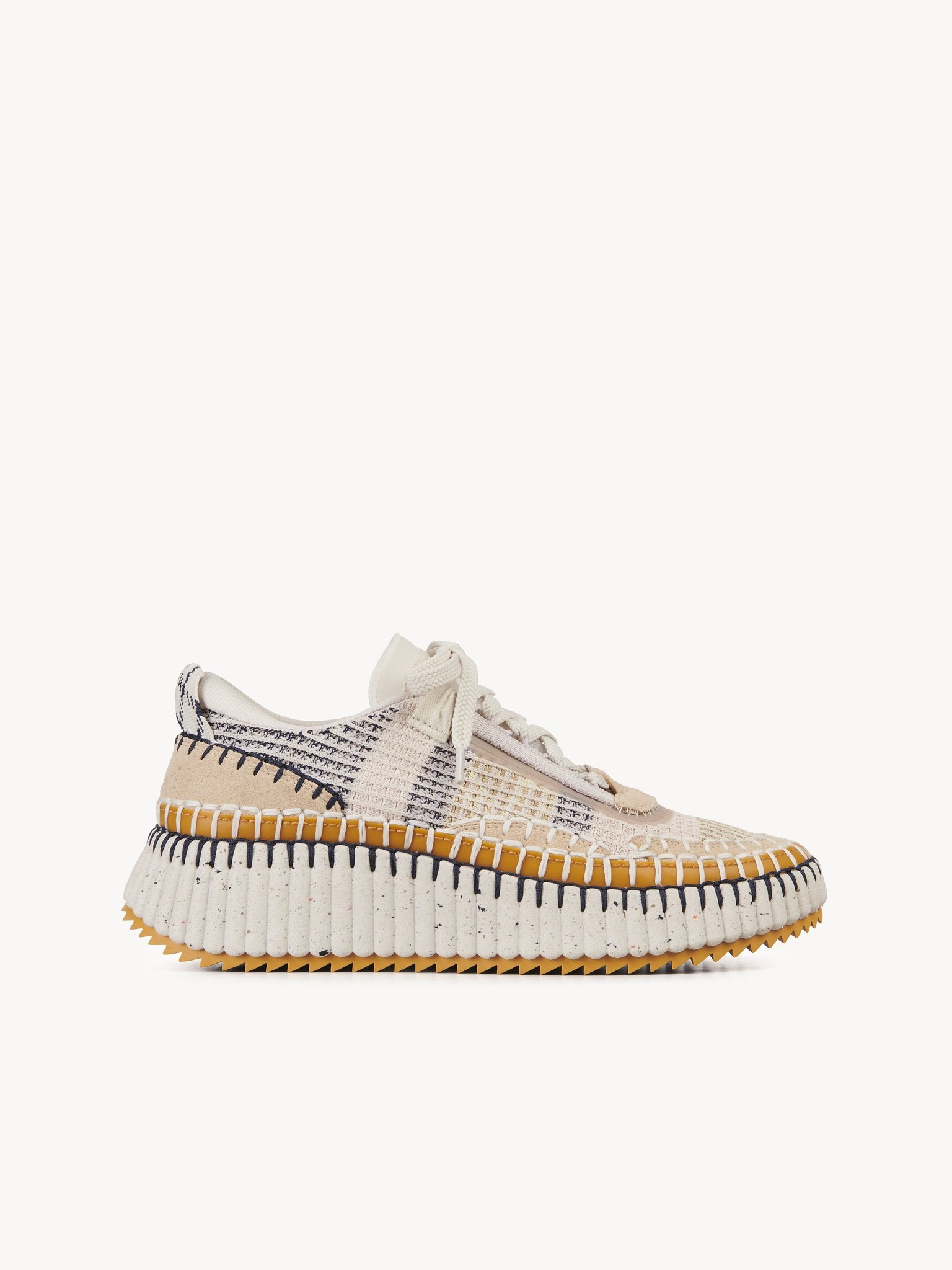 Rooted in the Maison's commitment to sustainability, the eco-designed Nama sneaker is crafted from a rich mix of materials with 40% of its weight made up of recycled debris. The bold, lightweight structure features a hand-stitched mesh upper, showcasing authentic Chloé craftsmanship. Set on a contrasting, ridged sole, this unisex sneaker is ultra-comfortable with a cool, sporty aesthetic. The Chloé logo at the back adds a signature touch. PRODUCT DETAILS Sneaker heel height: 2" (5 cm) Heel-to-toe drop: 0.8” (2 cm) Upper: All webbings in 100% recycled nylon, 100% recycled polyester and 100% recycled cotton Laces: 100% recycled polyester Knit: 90% recycled polyester yarns Suede skin Heat press: 40% recycled TPU Microsuede: 65% recycled Transparent Mesh: 100% recycled nylon Sole: Sole is assembled using water-based glue, which uses fewer chemicals than solvent-based glue Welt: 20% recycled TPE Midsole: 20% recycled EVA Downsole: 20% recycled rubber Internal Components: Lining: 70% recycled polyester Foam: 80% recycled PU Footbed lining in calfskin Footbed: 30% recycled EVA Fit true to size, European sizing - Lace-up By purchasing this product, you are supporting sustainable leather manufacturing through the Leather Working Group. Color: Biscotti Beige Item code: CHC22S579Y0268