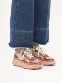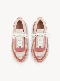 The Nama sneakers are crafted from recycled materials in a mix of contrasting colors and textures. These sneakers are set on an iconic, lightweight and ultra-comfortable sole with a speckled effect, and finished with immaculate blanket stitching which takes 4.5 hours to complete by hand. The Chloe logo signs the back. PRODUCT DETAILS Sneaker heel height: 2" (5 cm) Heel-to-toe drop: 0.8" (2 cm) Inner sole: calfskin Main lining: polyester Secondary lining: 50% nylon (textile), 50% polyurethane Sole: 60% ethylene vinyl acetate, 40% rubber Upper 1: polyester Upper 2: suede cowhide Upper 3: 60% polyurethane, 40% thermoplastic polyurethane Fit true to size, European sizing - Lace-up To make this product, Chloe worked with Leather Working Group (LWG) certified leather manufacturers. LWG certifies tanneries based on their water and energy usage, management of chemicals, solid waste, and wastewater. The polyester we use is made of recycled plastic, sourced mainly from water bottles. Recycled nylon keeps its inherent durability and softness, with a reduced environmental impact. Using recycled nylon enables us to extend the lifespan of a material that has already been produced. Color: Blooming Rose Item code: CHC22S579Y06C8