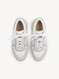 Rooted in the Maison's commitment to sustainability, these eco-designed Nama sneakers are crafted from suede cowhide and a mix of lower-impact materials, with 40% of their weight made up of recycled debris. Set on a chunky, ridged sole, the ultra-comfortable, lightweight structure features a hand-stitched mesh upper, finished with the signature Chloé logo on the back and tongue. Wear all year round for a city attitude. PRODUCT DETAILS Sneaker heel height: 2" (5 cm) Heel-to-toe drop: 0.8" (2 cm) Inner sole: calfskin Main lining: polyester Secondary lining: 50% nylon (textile), 50% polyurethane Sole: 60% ethylene vinyl acetate, 40% rubber Upper 1: polyester Upper 2: suede cowhide Upper 3: 60% polyurethane, 40% thermoplastic polyurethane Fit true to size, European sizing - Lace-up To make this product, Chloé worked with Leather Working Group (LWG) certified leather manufacturers. LWG certifies tanneries based on their water and energy usage, management of chemicals, solid waste, and wastewater. The polyester we use is made of recycled plastic, sourced mainly from water bottles. Recycled nylon keeps its inherent durability and softness, with a reduced environmental impact. Using recycled nylon enables us to extend the lifespan of a material that has already been produced. Color: Delicate Blue Item code: CHC22S579Y041V