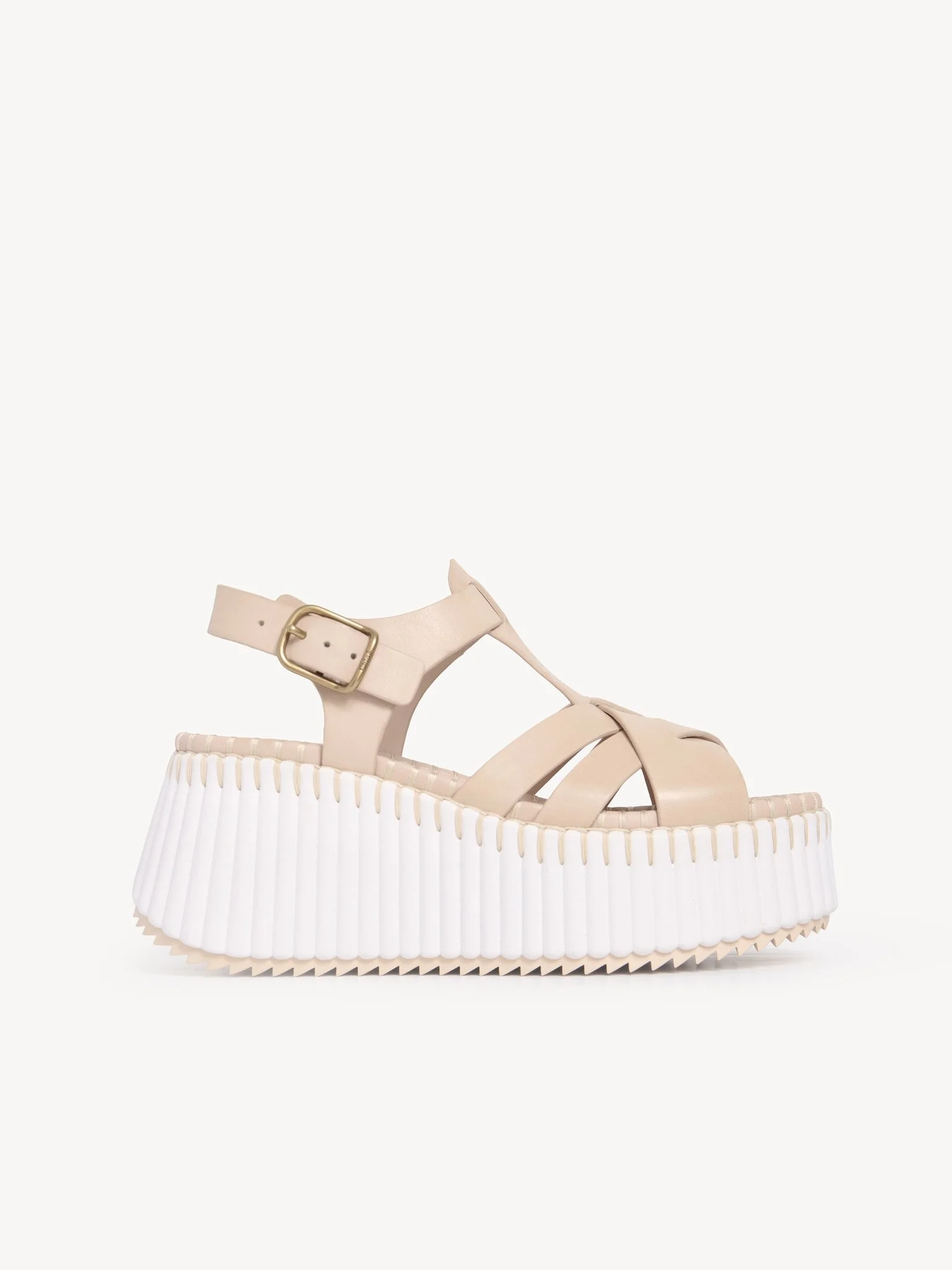 Rooted in the Maison's commitment to sustainability, the iconic Nama line includes these lower-impact wedges. Crafted from smooth cowhide and a mix of lower-impact materials, they are the perfect hybrid piece. Set on a chunky ridged sole, the upper features interwoven straps combined with tonal stitching. These ultra-comfortable wedge platform sandals are finished with a Chloe-engraved gold-tone buckle for an adjustable fit. PRODUCT DETAILS Wedge heel height: 3.1" (8 cm) Heel-to-toe drop: 1.8" (4.5 cm) Upper: smooth cowhide Inner sole: ethylene vinyl acetate Main lining: cowhide Secondary lining: cowhide Sole: 50% ethylene vinyl acetate, 50% rubber Fit true to size, European fit - Adjustable strap - Buckle fastening To make this product, Chloe worked with Leather Working Group (LWG) certified leather manufacturers. LWG certifies tanneries based on their water and energy usage, management of chemicals, solid waste, and wastewater. Color: Blushy Beige Item code: CHC24A05DNC26Y