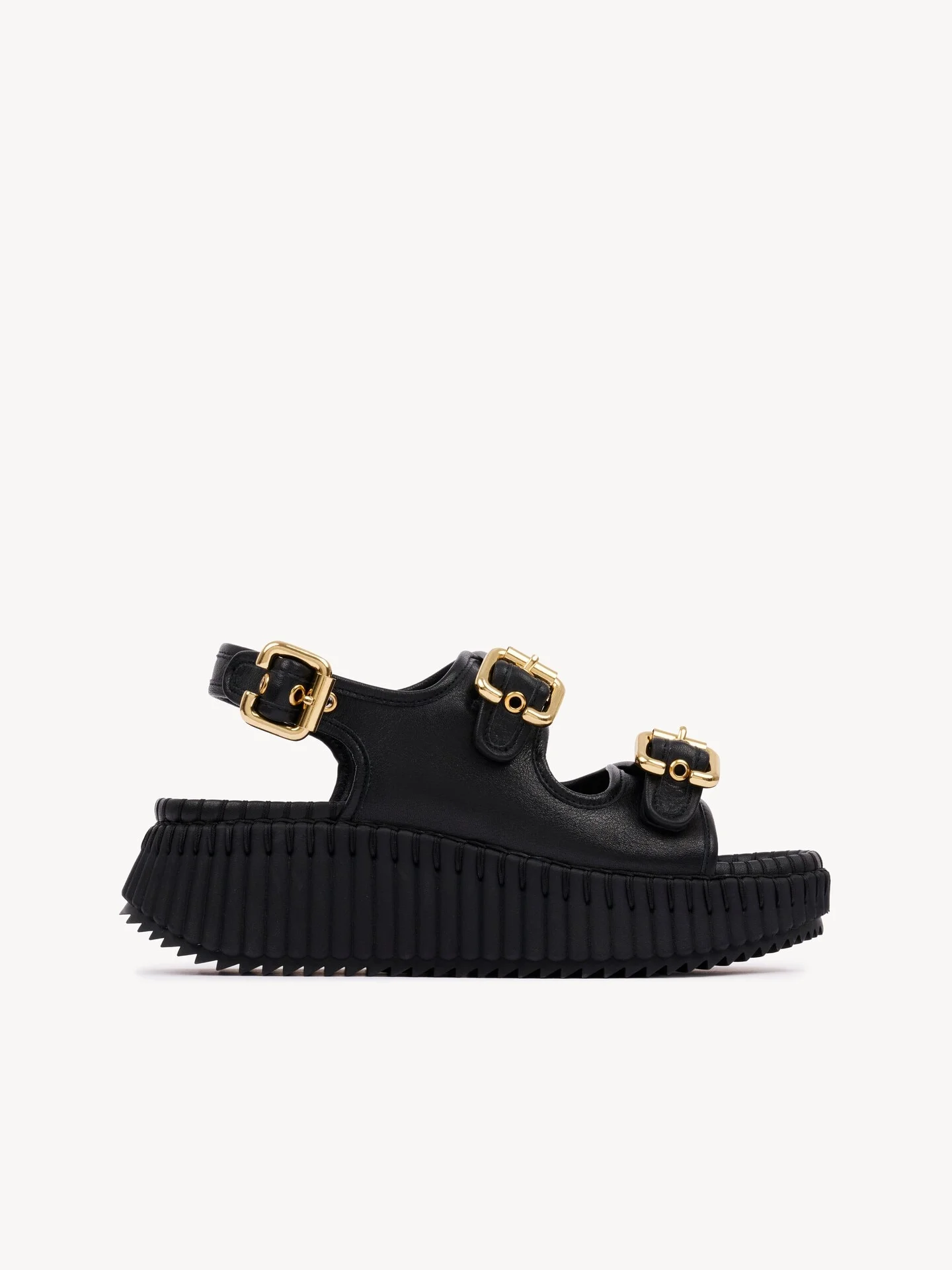 DESCRIPTION Crafted from cowhide, these Nama wedge sandals feature double front straps and an adjustable ankle strap finished with gold-tone Paddington buckles. They are set on an iconic, lightweight and ultra-comfortable recycled platform, finished with immaculate tonal blanket stitching which takes 4.5 hours to complete by hand. PRODUCT DETAILS Wedge sandal heel height: 2" (5 cm) Heel-to-toe drop: 0.8” (2 cm) Upper: cowhide Inner sole: cowhide Main lining: cowhide Sole: 50% rubber, 50% EVA Fit true to size, European sizing - Buckle fastening To make this product, Chloe worked with Leather Working Group (LWG) certified leather manufacturers. LWG certifies tanneries based on their water and energy usage, management of chemicals, solid waste, and wastewater. Color: Black Item code: CH26S17KSN001 CARE INSTRUCTIONS Simple but frequent maintenance is necessary in order to keep your NAMA sneakers looking as good as new. A few simple steps are all that’s needed to take care of them.Remove the laces from your NAMA sneakers and rub them gently with a little bit of soap, rinse them off and dry them with a soft cloth.Use a soft shoe brush to remove dust and dirt from the outsole and upper.The fabric parts can be cleaned with a soft, slightly damp cloth.To maintain the velvety appearance of suede or nubuck leather, gently clean with a crepe brush. If your sneakers get wet, remove the insole and leave to dry in a well-ventilated place. You should not put your sneakers in the washing machine or use abrasive products such as bleach. Do not tumble dry your sneakers.Fill your sneakers with tissue paper to maintain the original shape, then place them in the two protective covers provided. Store them in a cool, dry place.