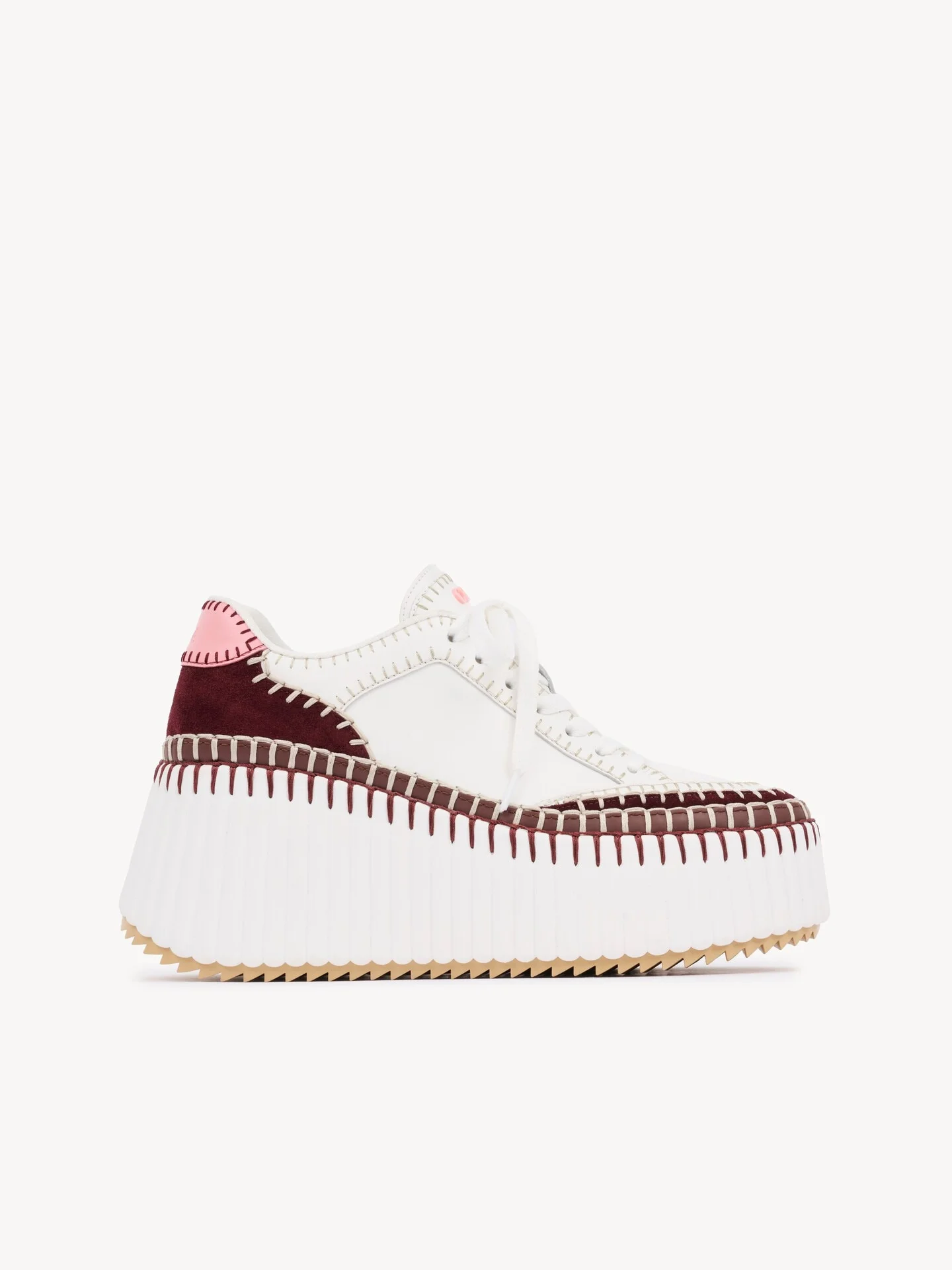 DESCRIPTION Crafted from smooth and suede cowhide, these Nama wedge sneakers are set on an iconic, lightweight and ultra-comfortable recycled sole. They are finished with immaculate blanket stitching which takes 4.5 hours to complete by hand. An embroidered Chloe logo signs the tongue while a debossed logo finishes the back. PRODUCT DETAILS Wedge sneaker heel height: 3.1" (8 cm) Heel-to-toe drop: 1.8" (4.5 cm) Upper 1: smooth cowhide Upper 2: suede cowhide Inner sole: EVA Main lining: 95% polyester, 5% elastane Sole: 50% EVA, 50% rubber Fit true to size, European sizing - Lace-up To make this product, Chloe worked with Leather Working Group (LWG) certified leather manufacturers. LWG certifies tanneries based on their water and energy usage, management of chemicals, solid waste, and wastewater. Color: Burgundy Pink Item code: CHC24U02IBD6BG CARE INSTRUCTIONS Simple but frequent maintenance is necessary in order to keep your NAMA sneakers looking as good as new. A few simple steps are all that’s needed to take care of them.Remove the laces from your NAMA sneakers and rub them gently with a little bit of soap, rinse them off and dry them with a soft cloth.Use a soft shoe brush to remove dust and dirt from the outsole and upper.The fabric parts can be cleaned with a soft, slightly damp cloth.To maintain the velvety appearance of suede or nubuck leather, gently clean with a crepe brush. If your sneakers get wet, remove the insole and leave to dry in a well-ventilated place. You should not put your sneakers in the washing machine or use abrasive products such as bleach. Do not tumble dry your sneakers.Fill your sneakers with tissue paper to maintain the original shape, then place them in the two protective covers provided. Store them in a cool, dry place.
