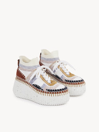 Showcasing a bold wedge silhouette, the eco-designed Nama wedge sneaker is crafted from lower-impact mesh with a recycled sole. This revisited shape features a soft slip-on sock upper for a comfortable fit with a casual allure. The exaggerated ribbed wedge structure is matched with a hand-stitched upper, showcasing authentic Chloé craftsmanship with a sporty twist. An embossed Chloé logo at the back adds a signature touch. PRODUCT DETAILS Wedge sneaker heel height: 3.1" (8 cm) Heel-to-toe drop: 1.2” (3 cm) Main lining: 88% polyester, 12% polyurethane Sole: 60% ethylene vinyl acetate, 40% rubber Upper 1: 90% polyester, 10% thermoplastic polyurethane Upper 2: 100% suede cowhide Upper 3: 60% polyester, 40% thermoplastic polyurethane Upper 4: 80% nylon, 20% polyurethane Upper 5: polyester Fit true to size, European sizing - Lace-up sneaker The polyester we use is made of recycled plastic, sourced mainly from water bottles. Recycled nylon keeps its inherent durability and softness, with a reduced environmental impact. Using recycled nylon enables us to extend the lifespan of a material that has already been produced. Color: Red Sand Item code: CHC23A909Y0651