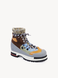 Inspired by vintage ski boots, the Nikie hiking bootie exudes an adventurous, sporty attitude while also making a bold winter fashion statement. Made from a rich, textural interplay of materials, the daring lace-up boot features a contrasting palette inspired by the Maison's cross-category Climate Success story. Suede and smooth calfskin are combined with textile trims and a knitted sock anchored in the Chloé DNA. The lower-impact recycled midsole adds decorative color contrast, while two different lace lengths allow for two different styles. PRODUCT DETAILS Hiking bootie Heel height: 1.6” (4 cm) Heel-to-toe drop: 0.6” (1.5 cm) - Upper 1: suede calfskin - Upper 2: smooth calfskin - Upper 3: 50% polyester, 35% polyamide, 15% elastane - Upper 4: wool - Main lining: 40% polyester, 30% elastane, 30% polyamide - Secondary lining: suede calfskin - Inner sole: calfskin - Midsole: recycled ethylene vinyl acetate - Sole: thermoplastic polyurethane - Heel: calfskin Fit true to size, European sizing - Hiking boot - Lace-up boot By purchasing this product, you are supporting sustainable leather manufacturing through the Leather Working Group Color: Blue & Brown Item code: CHC22W734W099L
