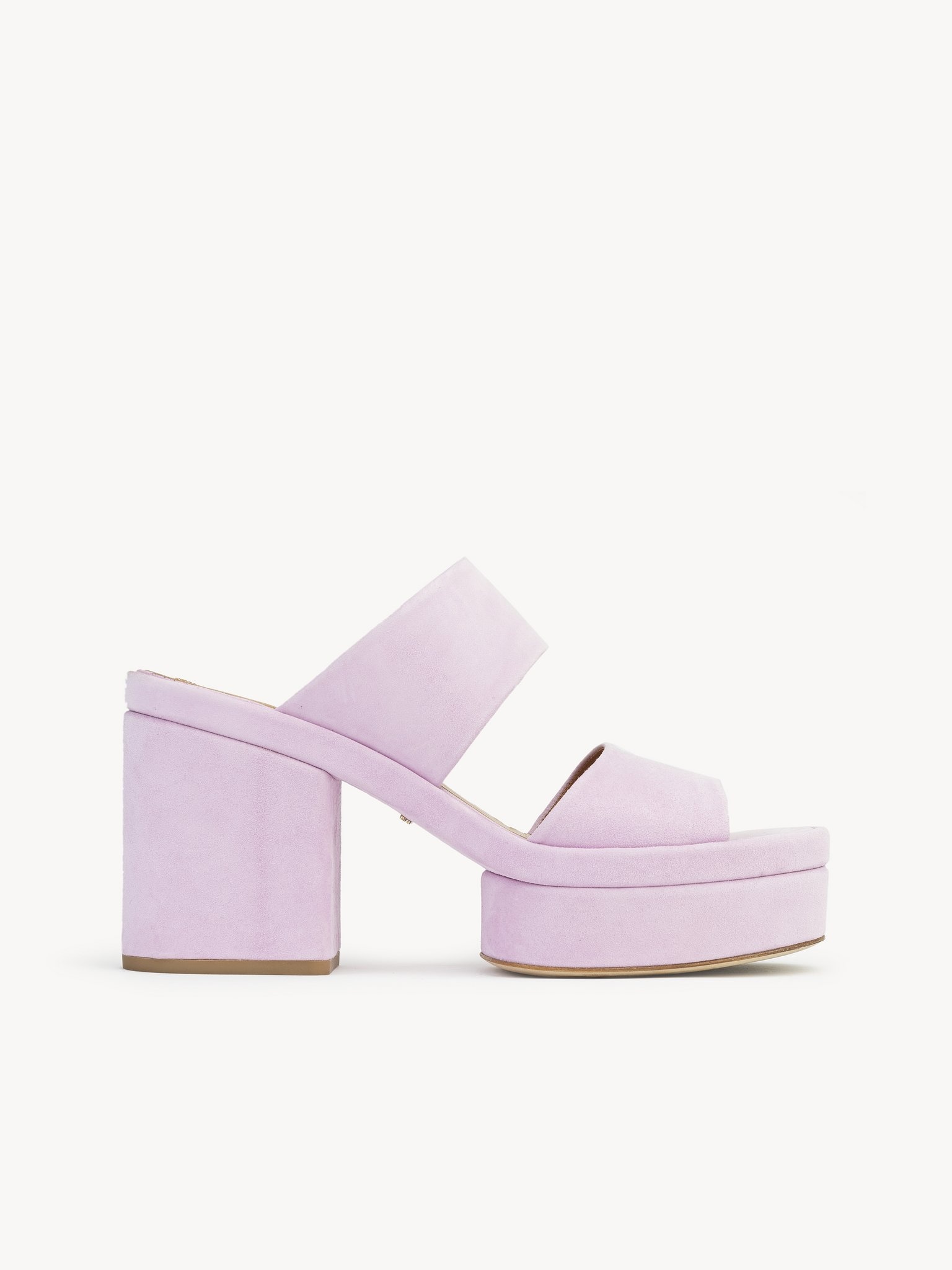 Brazen yet elegant, the Odina slip-on high-heel sandal combines a suede goatskin upper with a sturdy platform sole and an elevated block heel. A drawing by creative director Gabriela Hearst at the age of 17 inspired the bold, feminine design. The effortless slip-on design exudes a relaxed summer attitude. PRODUCT DETAILS High-heel sandal heel height: 3.9" (10 cm) Heel-to-toe drop: 2.6" (6.5 cm) - Upper: sheepskin - Main lining: cowhide - Inner sole: 80% young goatskin, 20% suede goatskin - Sole: 55% cow nubuck leather, 45% suede goatskin - Heel: suede goatskin Fit true to size, European sizing - Slip-on To make this product, Chloé worked with Leather Working Group (LWG) certified leather manufacturers. LWG certifies tanneries based on their water and energy usage, management of chemicals, solid waste, and wastewater. Color: Creamy Lilac Item code: CHC23S784CJ51H
