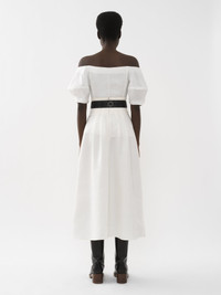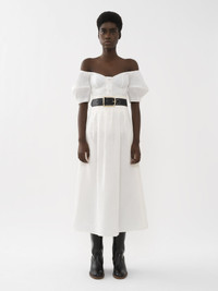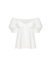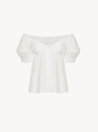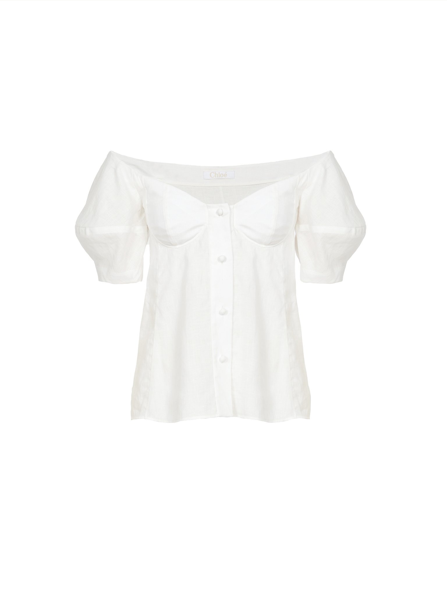Cut from soft voile linen, this off-the-shoulder top features short balloon sleeves and bustier-inspired stitching for a regal aesthetic. Self-covered buttons lend a refined finish to the fitted design. This product was made in collaboration with Akanjo, a certified WFTO supplier. Akanjo is a social enterprise in Madagascar that places equal pay and employees’ health & wellbeing at the core of their priorities. A long-standing partner of Chloé for 15 years, Akanjo is also committed to training and promoting craftsmanship. PRODUCT DETAILS Off-the-shoulder top main material: 100% Linen Care: dry cleaning only, delicate Fit: fitted, short sleeves - The model is 5’10” (178 cm) and wears a prototype in size 34 - Fitted top - Self-covered buttons through front Linen, hemp and ramie cultivations emit fewer greenhouse gases and require less water compared to other conventional natural fibers, which is why they are considered lower-impact materials by nature. Color: Iconic Milk Item code: CHC22AHT29134107