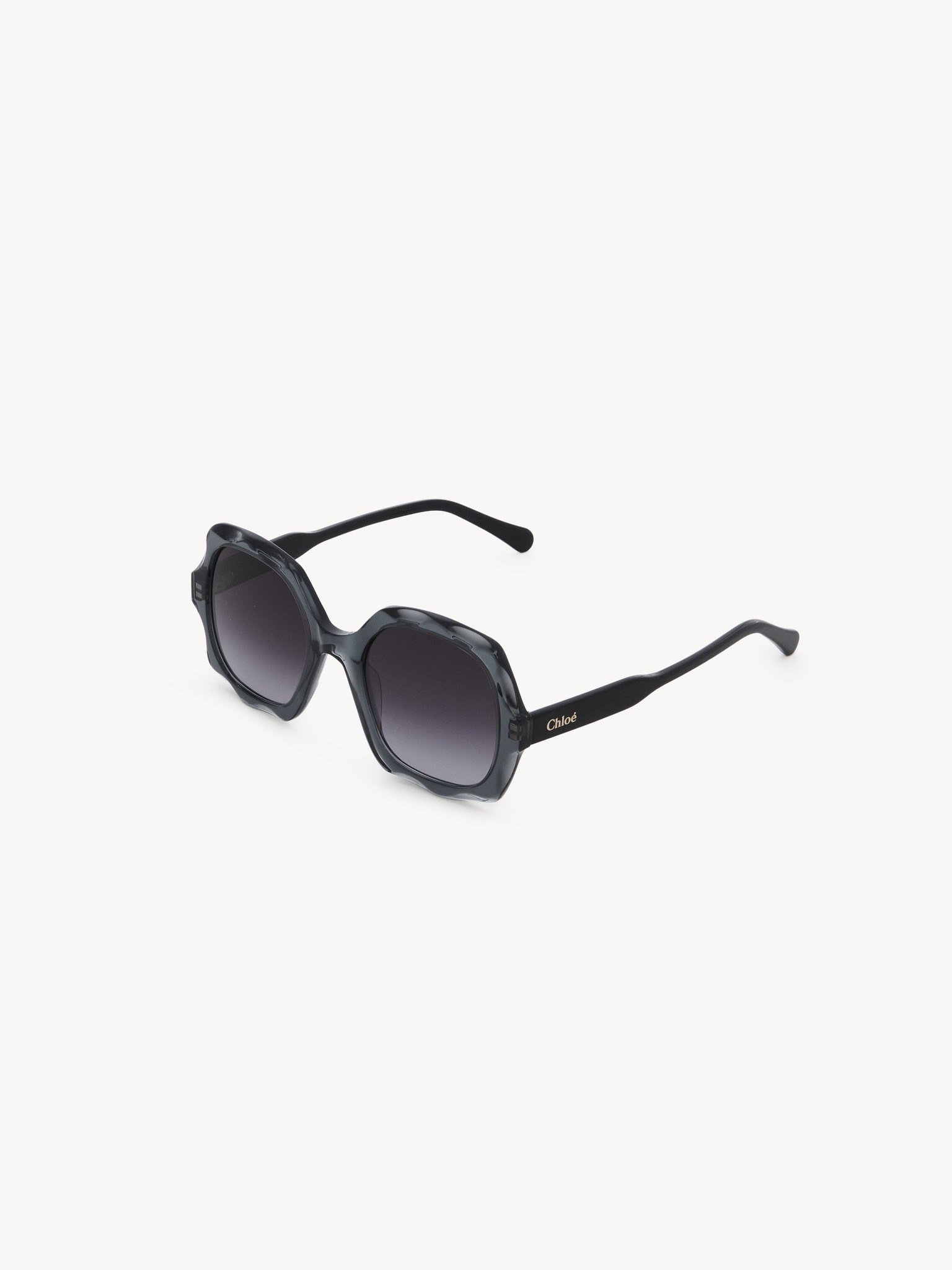 The Olivia square sunglasses reinterpret the Maison's signature scalloping in this youthful, modern style. Crafted from lower-impact acetate and bio-based nylon, they feature a 3D-effect scalloped front in translucent dark gray paired with contrasting shiny black temples. The square shape creates a retro, feminine allure while gradient gray lenses complement the soft color palette. A gold-toned Chloe logo engraving on both temples finishes these fresh and summery women's sunglasses. PRODUCT DETAILS Square sunglasses in lower-impact acetate & bio-based nylon - 100% UVA and UVB protection - Not prescription friendly - Filter category: 3 - Chloe logo engraved on both temples - Made in Italy These sunglasses for women come with a case and lens cloth - Lens: 2.1" (53 mm) - Bridge: 0.9" (22 mm) - Temple: 5.7" (145 mm) - Transparent Dark Grey frame - Gradient Grey lenses Item code: CHC24SEK0226001