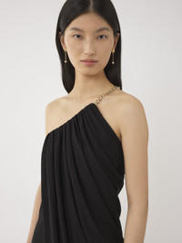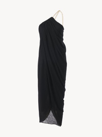 Crafted from luxurious light wool crêpe jersey, this one-shoulder midi dress has a draped silhouette for an elevated allure suited to special ceremonies and occasions. The bare shoulder enhances the feminine attitude, while a hand-applied chain strap adds jewelry-inspired detail for elegant cocktailwear. PRODUCT DETAILS One-shoulder midi dress main material: 100% Wool Lining: 100% Silk Care: dry cleaning only Fit: midi length - The model is 5'10" (178 cm) and wears a prototype in size 36 - Draped wool dress - Chain strap with adjustable clasp Color: Black Item code: CHC24SRO20080001