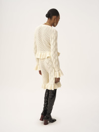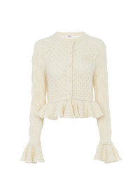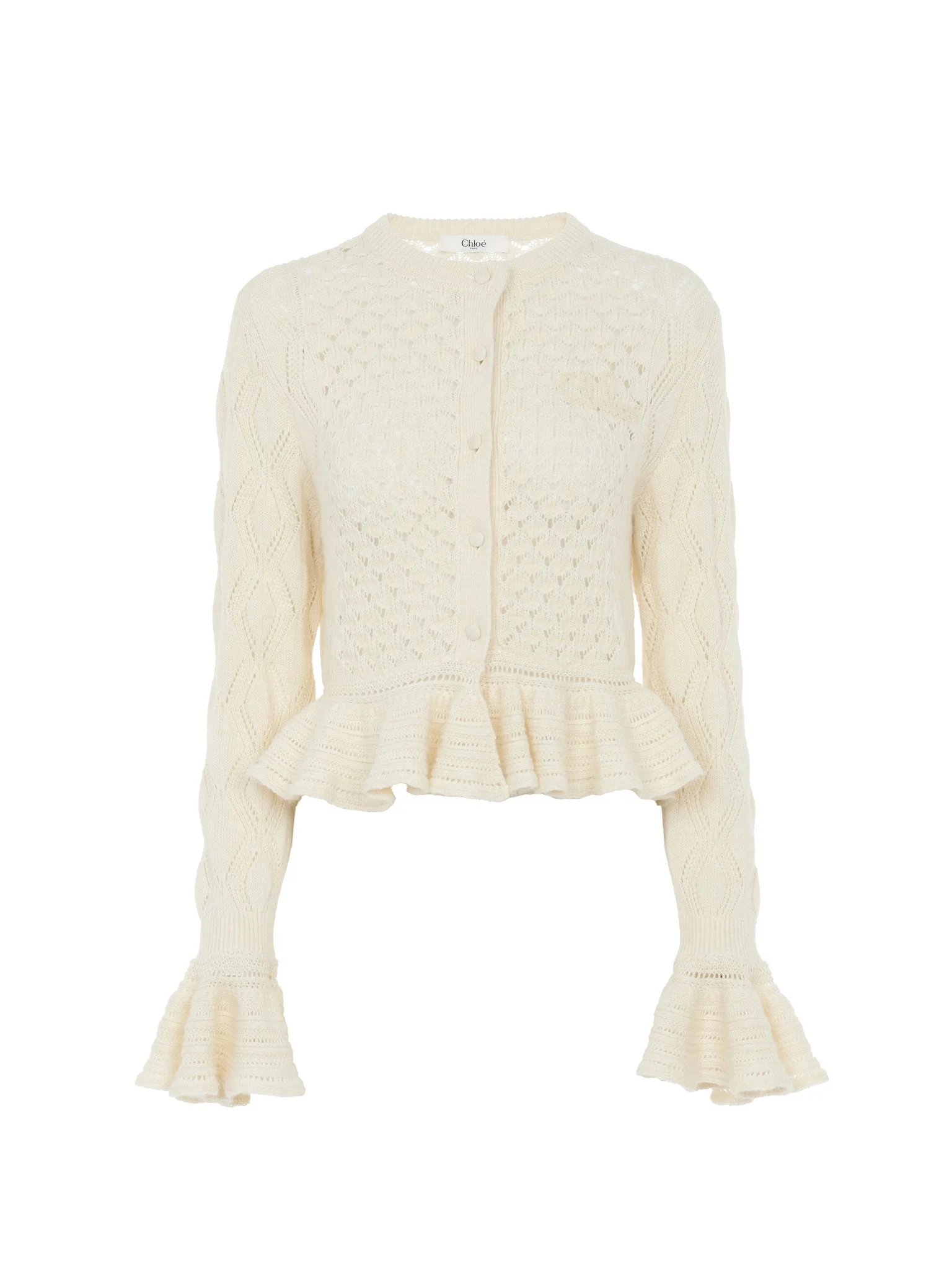 Crew-neck, cropped and ruffled cardigan in a silk, alpaca wool and cotton pointelle knit, featuring a flouncy hem and cuffs. Tonal Chloe logo embroidery and fabric-covered buttons at the front finish this piece. PRODUCT DETAILS Ruffled cardigan outer shell: 70% Cotton, 18% Alpaca wool, 11% Silk, 1% Polyamide Fit: cropped, fitted - The model is 5'10" (178 cm) and wears a prototype in size S - Cropped cardigan - Fabric-covered buttons through front An organic cotton farming system sustains the health of soils, ecosystems and people by eliminating the use of toxic and persistent organic pollutants and increasing water conservation. Color: Iconic Milk Item code: CH25AMC01590107