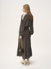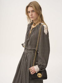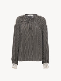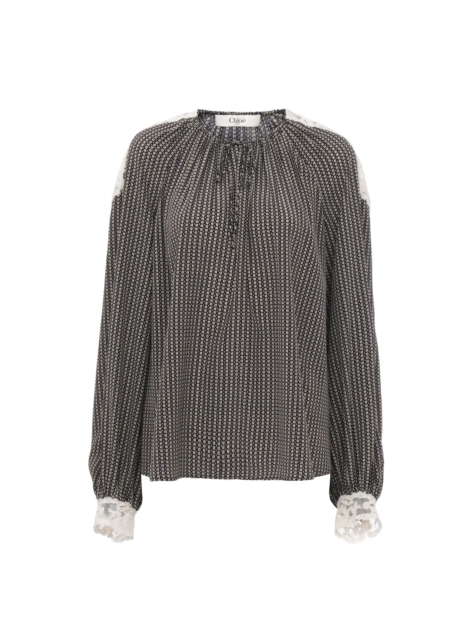 Open-neck top in organic silk crepe de chine with a graphic print, featuring contrast lace inserts at the shoulders and cuffs. A drawstring neckline finishes this fluid piece. PRODUCT DETAILS Open-neck top outer shell: 100% Silk Lacework: 100% Polyester Buttons: 100% Mother-of-pearl Fit: fluid - The model is 5'10" (178 cm) and wears a prototype in size 36 - Printed long-sleeve top - Mother-of-pearl buttons at cuffs - Drawstring neckline Organic silk manufacturing restricts the use of pesticides, insecticides or harsh chemicals and incorporates methods that respect biodiversity, improve soil quality and reduce water consumption. This product was made by Marie Helene Couture, a long-standing partner of Chloe based in Morlaas, France. Marie Helene Couture excels in the specialized technique of couture "flou." Their expertise aligns with the rigorous standards set by the "metiers de la mode, vetement flou" certification, ensuring a high level of professional aptitude in this delicate and skilled art form. Color: Black Item code: CH25AHT25145905