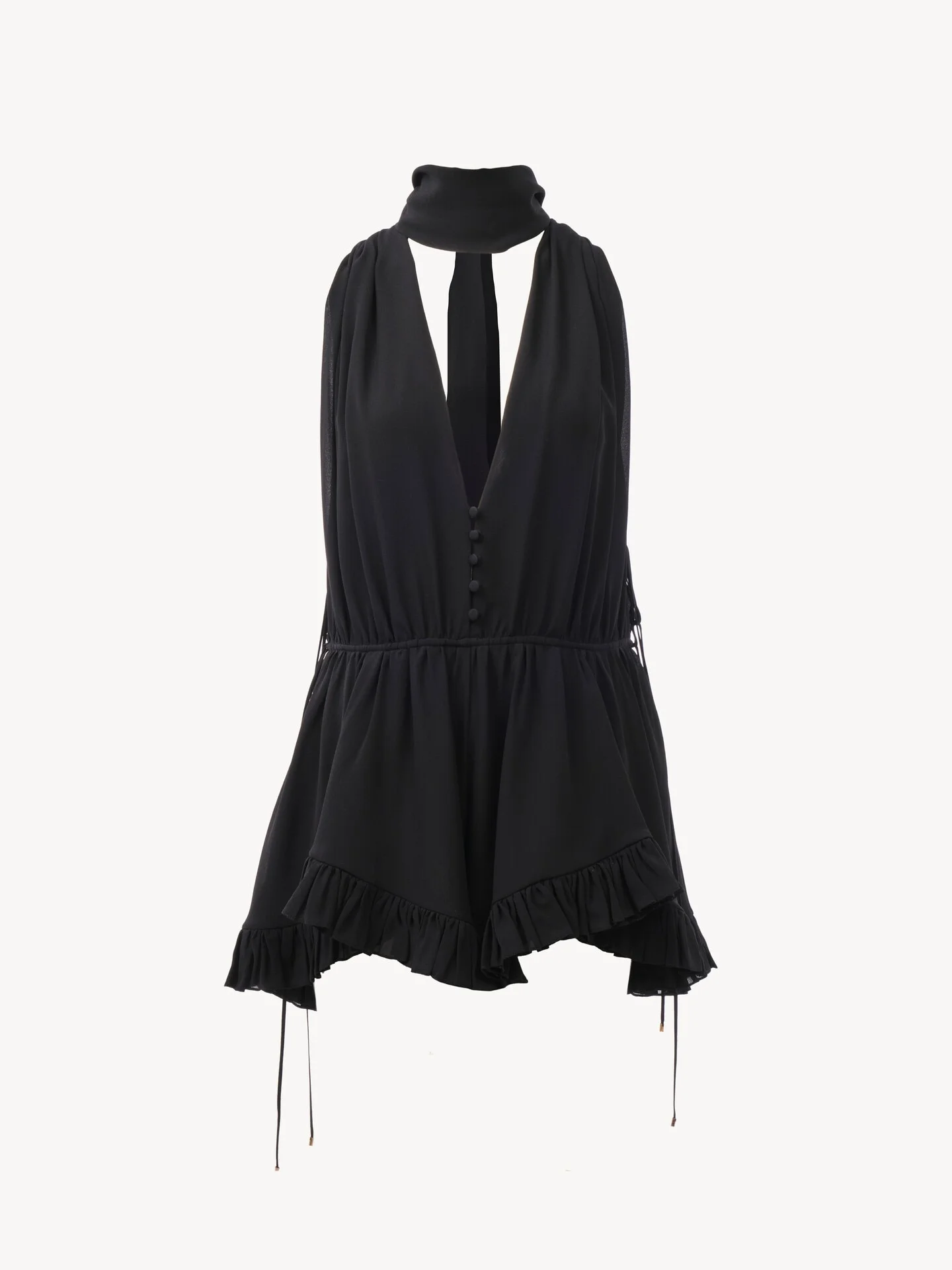 DESCRIPTION Deep V-neck ruffled jumpsuit in organic silk georgette with a scarf tied at the back. Ruffle trims detail the hem, while the drawstring waist features dangling ties finished with gold-tone metal tips. PRODUCT DETAILS Ruffled jumpsuit outer shell: 100% Silk Buttons: 100% Mother-of-pearl Fit: fluid - The model is 5'10" (178 cm) and wears a prototype in size 36 - Sleeveless jumpsuit - Fabric-covered buttons at front - Mother-of-pearl buttons at back - Drawstring waist with hammered metal tips - Integrated scarf tied at back Organic silk manufacturing restricts the use of pesticides, insecticides or harsh chemicals and incorporates methods that respect biodiversity, improve soil quality and reduce water consumption. Color: Black Item code: CH25ASL02117001 CARE INSTRUCTIONS To preserve the integrity of your garment, please refrain from washing, entrusting its care to professional cleaning services for optimal maintenance. This garment cannot withstand any bleaching agent. To maintain its shape, gently iron this garment at a maximum sole plate temperature of 110°C, taking care to avoid any harsh pressure while ironing. Entrust this garment to a specialist for mild cleaning with tetrachloroethylene and solvent F, ensuring its delicate nature is maintained with the most care. To maintain its delicate nature, do not wet clean this garment. To best preserve its form and texture, please do not tumble dry this garment. TRACEABILITY Better traceability is central to improving our materials as well as social and environmental practices. Dyeing: Italy Finishing: Italy Weaving: Italy
