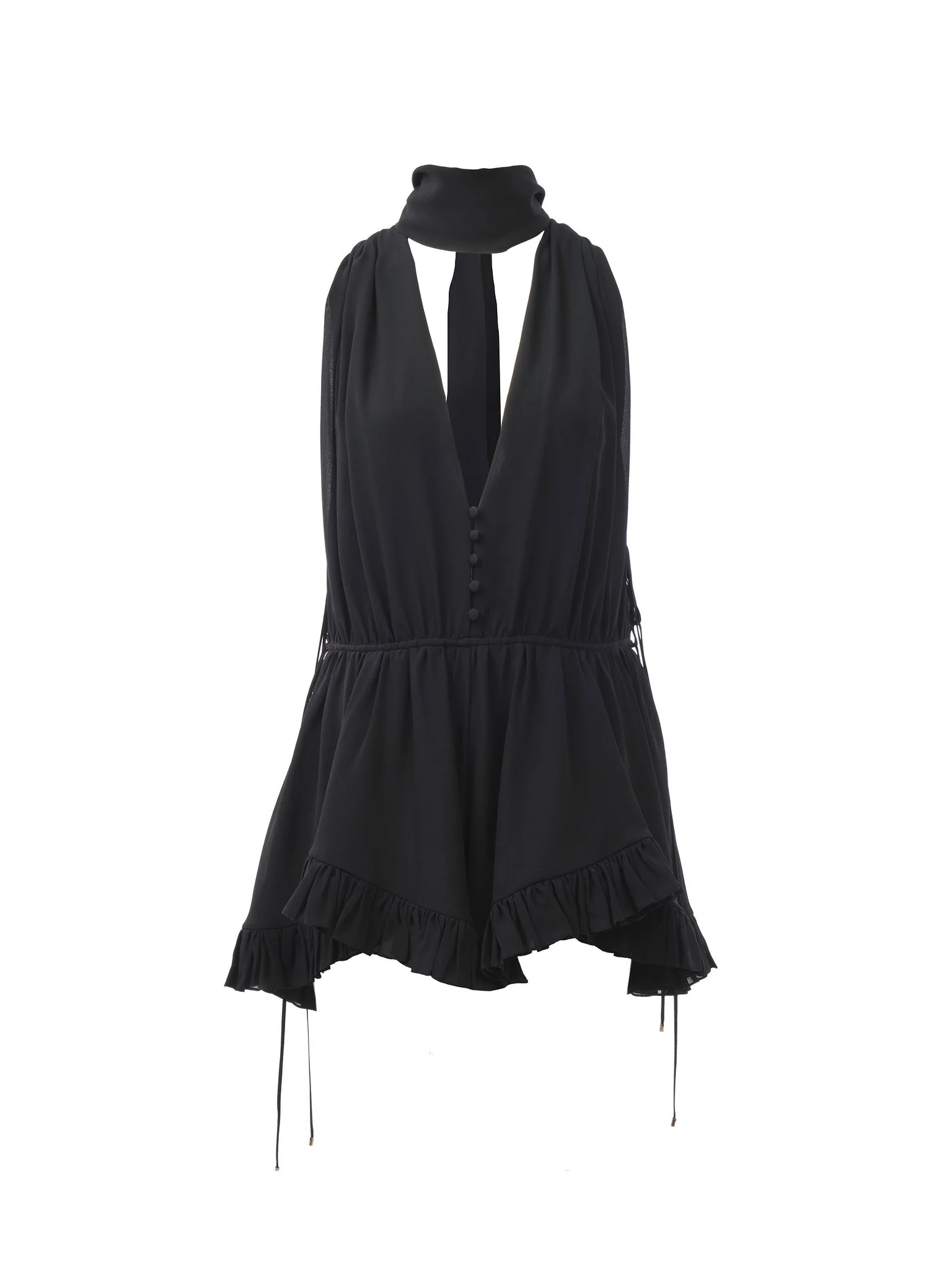 Deep V-neck ruffled jumpsuit in organic silk georgette with a scarf tied at the back. Ruffle trims detail the hem, while the drawstring waist features dangling ties finished with gold-tone metal tips. PRODUCT DETAILS Ruffled jumpsuit outer shell: 100% Silk Buttons: 100% Mother-of-pearl Fit: fluid - The model is 5'10" (178 cm) and wears a prototype in size 36 - Sleeveless jumpsuit - Fabric-covered buttons at front - Mother-of-pearl buttons at back - Drawstring waist with hammered metal tips - Integrated scarf tied at back Organic silk manufacturing restricts the use of pesticides, insecticides or harsh chemicals and incorporates methods that respect biodiversity, improve soil quality and reduce water consumption. Color: Black Item code: CH25ASL02117001