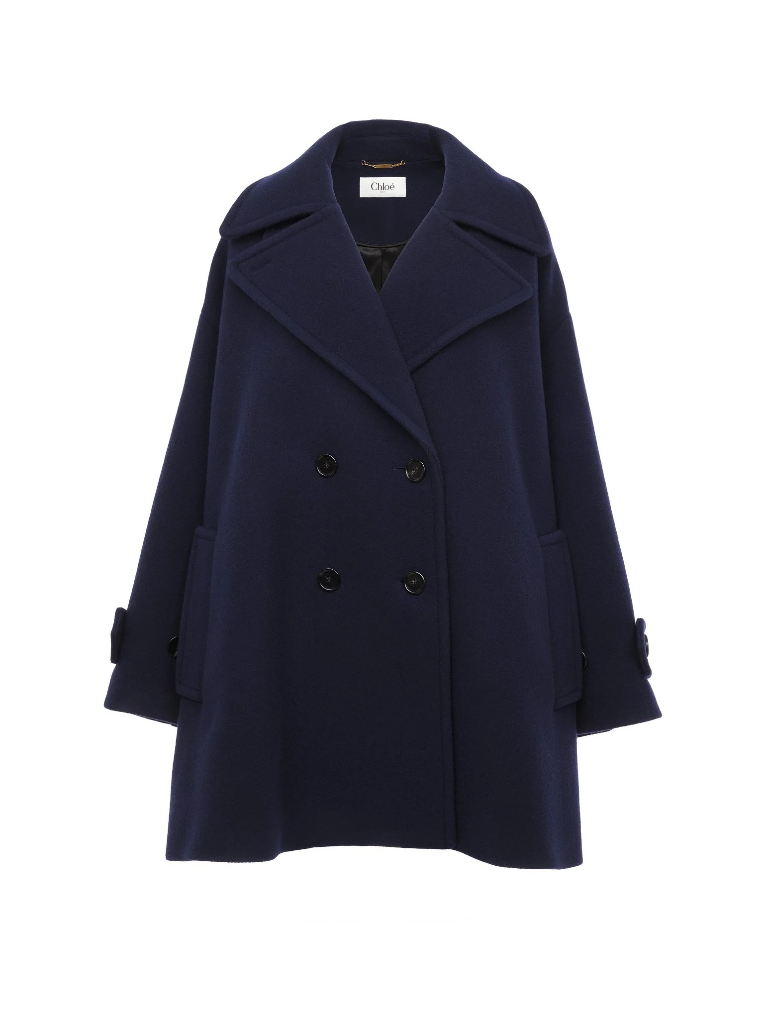 Oversized double-breasted coat in iconic soft wool with a chin-strap collar and horn buttons. PRODUCT DETAILS Oversized double-breasted coat outer shell: 80% Wool, 20% Polyamide Main lining: 62% Viscose, 38% Cotton Buttons: 100% Water buffalo horn Fit: oversized - The model is 5'10" (178 cm) and wears a prototype in size 36 - Oversized wool coat - Chin strap - Engraved horn buttons at chin strap, through front & at cuffs - Side pockets Color: Evening Blue Item code: CH25AMA2695248B