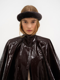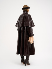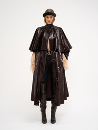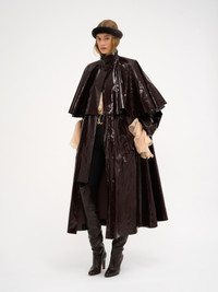 Oversized long parka in lacquered shiny cotton with a cape, a high collar, and a combination of horn and snap buttons. PRODUCT DETAILS Long parka outer shell: 100% Cotton Coating: 100% Polyurethane Removable cape: 100% Cotton Collar button: 100% Water buffalo horn Fit: long - The model is 5’10” (178 cm) and wears a prototype in size 38 - Shiny long coat - Horn & snap buttons Care: clean with a damp cloth or sponge, do not dry or wet clean. Color: Obscure Brown Item code: CH24WMA2014524Z