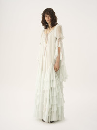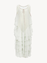 Scoop-neck oversized long ruffled dress in organic silk mousseline with a silk-mix lining, featuring tiered ruffles and drawstring ties. PRODUCT DETAILS Long ruffled dress outer shell: 100% Silk Lining: 68% Acetate fiber, 32% Silk Fit: oversized, long - The model is 5'10" (178 cm) and wears a prototype in size 36 - Oversized silk dress - Drawstring neck & sleeves Organic silk manufacturing restricts the use of pesticides, insecticides or harsh chemicals and incorporates methods that respect biodiversity, improve soil quality and reduce water consumption. This product was made in collaboration with Akanjo, a certified WFTO supplier. Akanjo is a social enterprise located in Madagascar that places equal pay and employees' health & wellbeing at the core of their priorities. A long-standing partner of Chloe for 15 years, Akanjo is also committed to training and promoting craftsmanship. Color: Slightly Grey Item code: CH25WRO6600101O