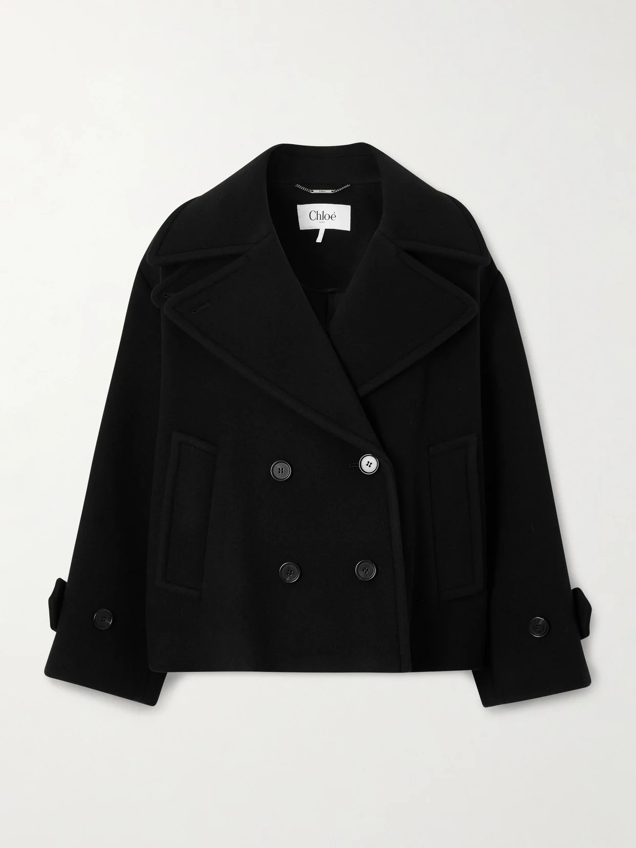 Chloe's coat is modeled on classic peacoats. Made from wool-blend, it has double-breasted front and oversized, slightly cropped shape that feels so fresh and cool.
