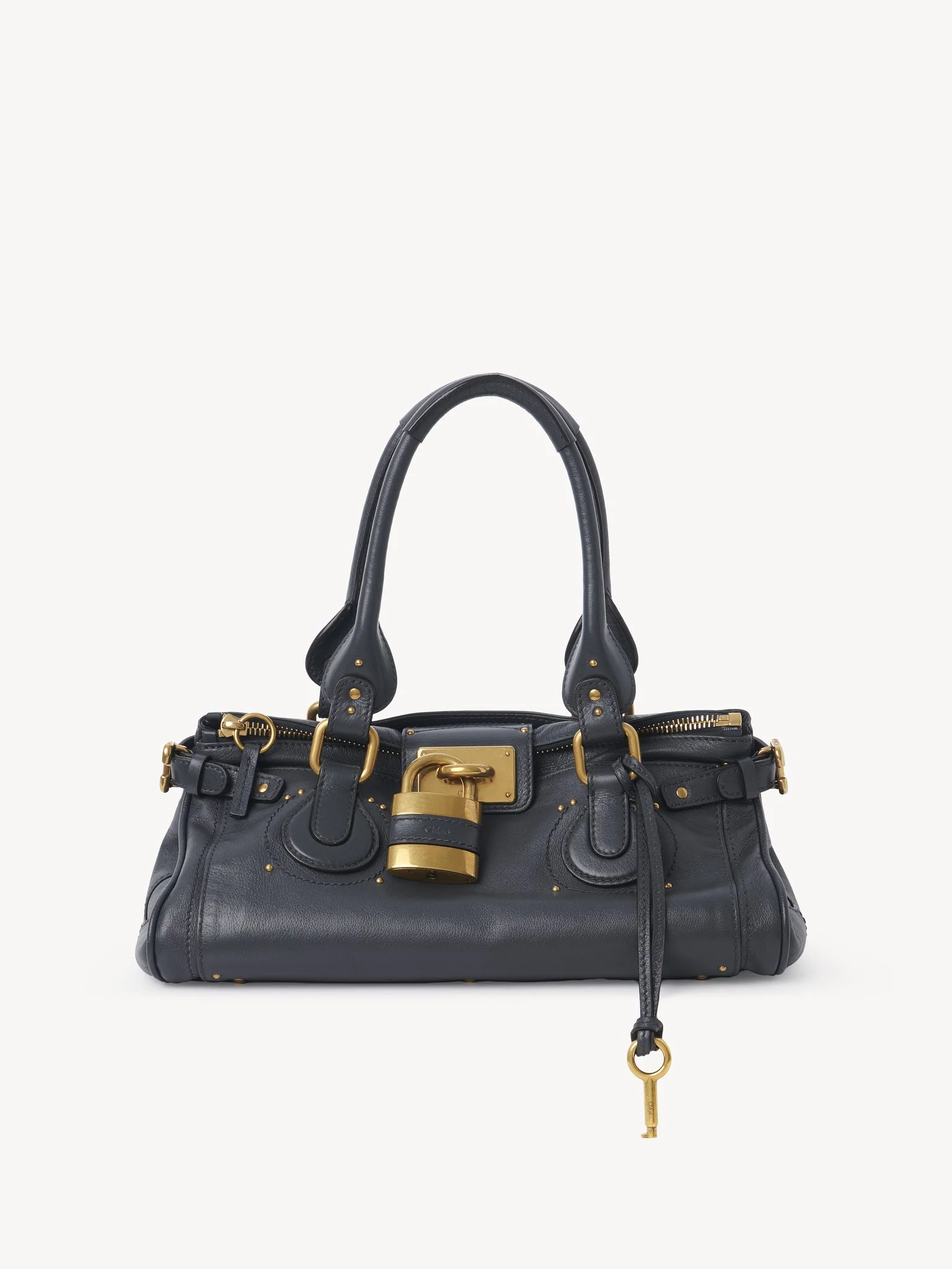 Rooted in the Maison's heritage, the iconic Paddington bag returns for its 20th anniversary with an updated design. Crafted from grained buffalo leather in a slouchy silhouette, it is lighter than the original bag, with a single zip for easy opening. The oversized padlock and C-shaped buckles add signature detail, while 52 studs pay tribute to the year in which the Maison was founded. PRODUCT DETAILS Paddington bag in grained buffalo leather Main material: Buffalo leather Main lining: Cotton Inside pocket lining: Cotton Outside pockets lining: Suede calfskin Padlock: Aluminum Carry: Hand & shoulder - 1 roomy main compartment - 1 front flat pocket - 1 back flat pocket - 1 inside zipped pocket - Zip closure Comes with a dust bag - Width: 14.2" (36 cm) - Height: 7.1" (18 cm) - Depth: 7.1" (18 cm) - Handle drop: 8.3" (21 cm) To make this product, Chloe worked with Leather Working Group (LWG) certified leather manufacturers. LWG certifies tanneries based on their water and energy usage, management of chemicals, solid waste, and wastewater. Color: Black Navy Item code: CH25WS802P7544C
