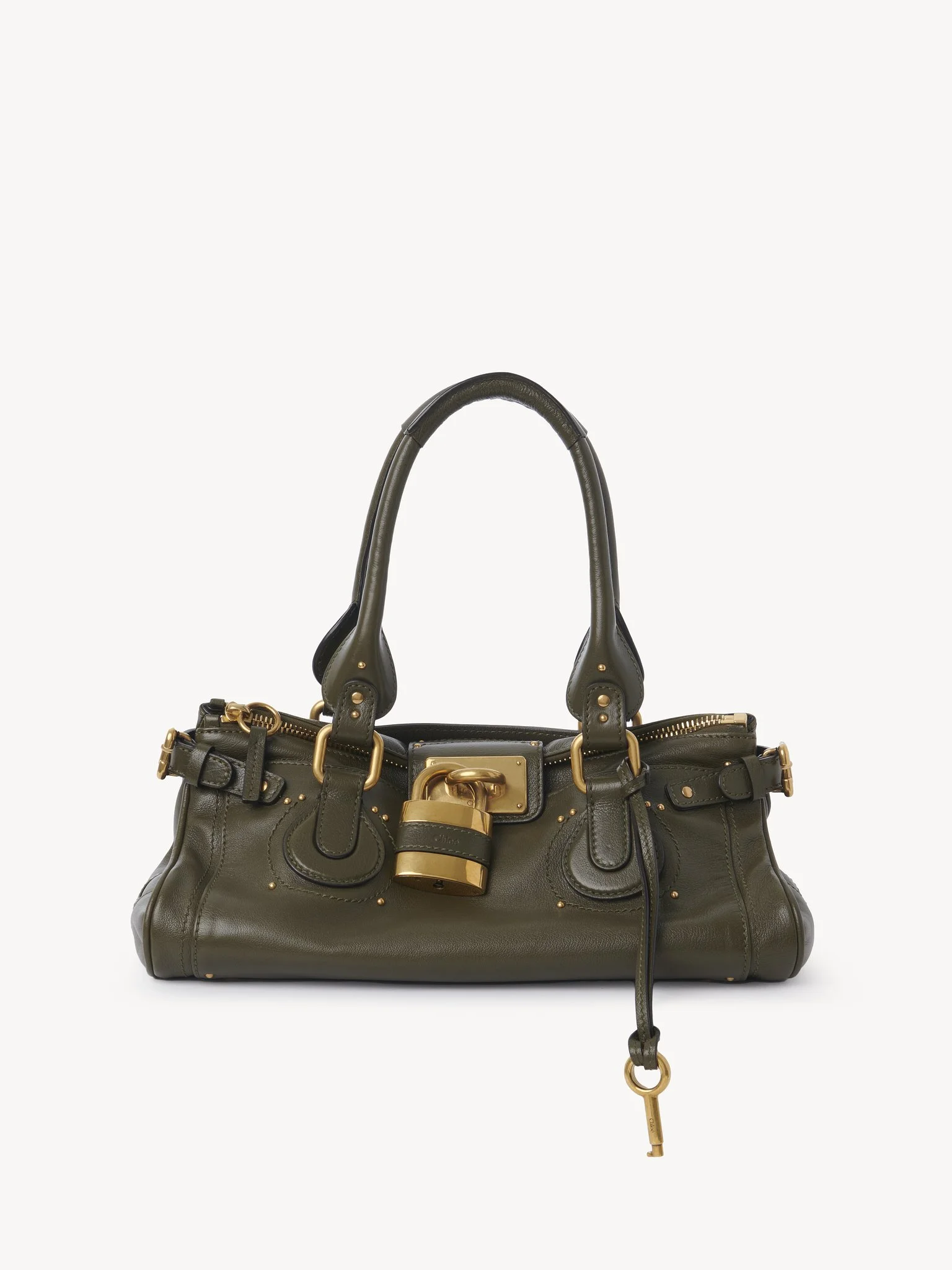 Rooted in the Maison's heritage, the iconic Paddington bag returns for its 20th anniversary with an updated design. Crafted from grained buffalo leather in a slouchy silhouette, it is lighter than the original bag, with a single zip for easy opening. The oversized padlock and C-shaped buckles add signature detail, while 52 studs pay tribute to the year in which the Maison was founded. PRODUCT DETAILS Paddington bag in grained buffalo leather Main material: Buffalo leather Main lining: Cotton Inside pocket lining: Cotton Outside pockets lining: Suede calfskin Padlock: Aluminum Carry: Hand & shoulder - 1 roomy main compartment - 1 front flat pocket - 1 back flat pocket - 1 inside zipped pocket - Zip closure Comes with a dust bag - Width: 14.2" (36 cm) - Height: 7.1" (18 cm) - Depth: 7.1" (18 cm) - Handle drop: 8.3" (21 cm) To make this product, Chloe worked with Leather Working Group (LWG) certified leather manufacturers. LWG certifies tanneries based on their water and energy usage, management of chemicals, solid waste, and wastewater. Color: Winter Ivy Item code: CH25WS802P753E5