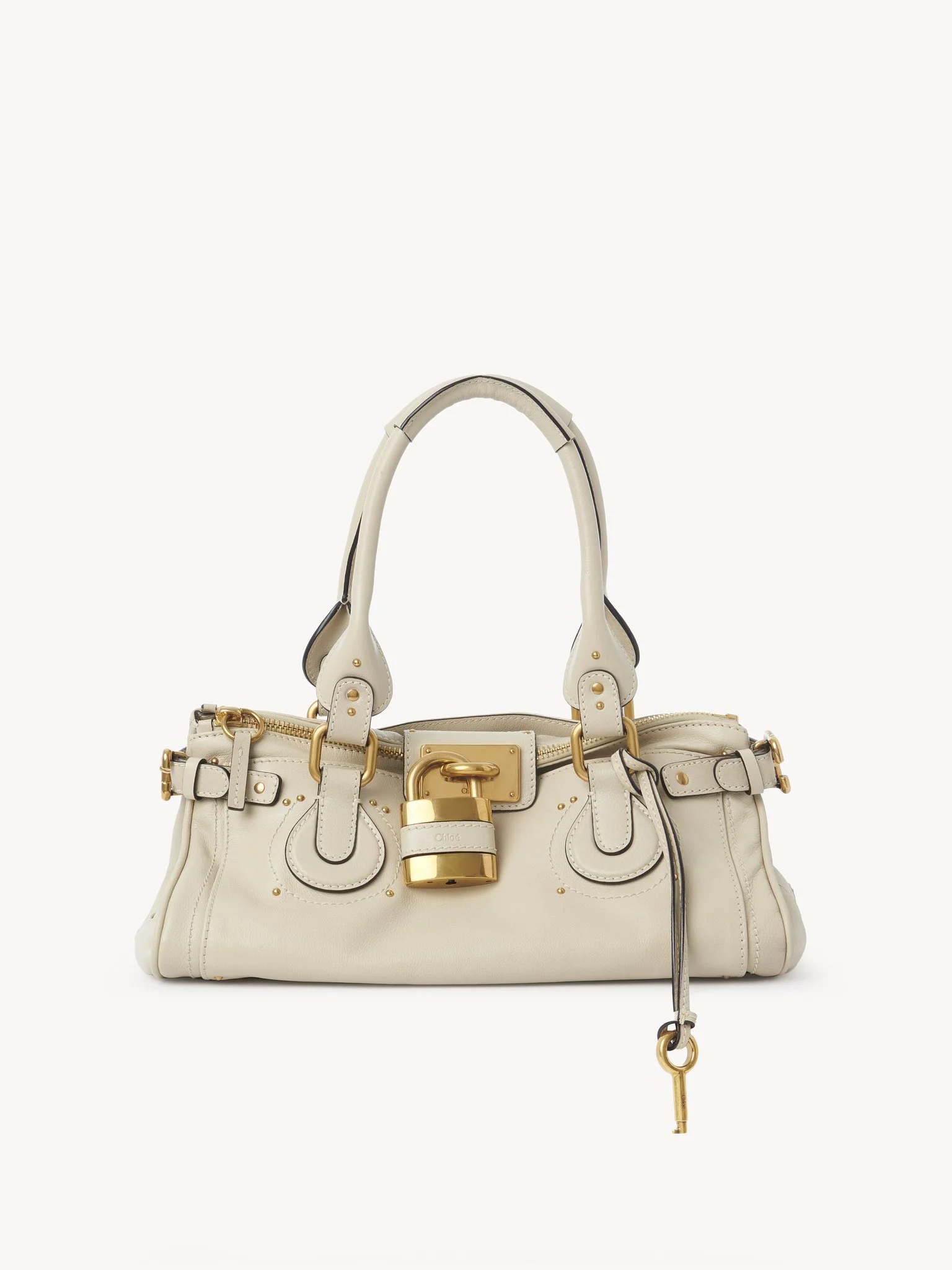 Rooted in the Maison's heritage, the iconic Paddington bag returns for its 20th anniversary with an updated design. Crafted from grained buffalo leather in a slouchy silhouette, it is lighter than the original bag, with a single zip for easy opening. The oversized padlock and C-shaped buckles add signature detail, while 52 studs pay tribute to the year in which the Maison was founded. PRODUCT DETAILS Paddington bag in grained buffalo leather Main material: Buffalo leather Main lining: Cotton Inside pocket lining: Cotton Outside pockets lining: Suede calfskin Padlock: Aluminum Carry: Hand & shoulder - 1 roomy main compartment - 1 front flat pocket - 1 back flat pocket - 1 inside zipped pocket - Zip closure Comes with a dust bag - Width: 14.2" (36 cm) - Height: 7.1" (18 cm) - Depth: 7.1" (18 cm) - Handle drop: 8.3" (21 cm) To make this product, Chloe worked with Leather Working Group (LWG) certified leather manufacturers. LWG certifies tanneries based on their water and energy usage, management of chemicals, solid waste, and wastewater. Color: Cloudy Cream Item code: CH25WS802P7520S