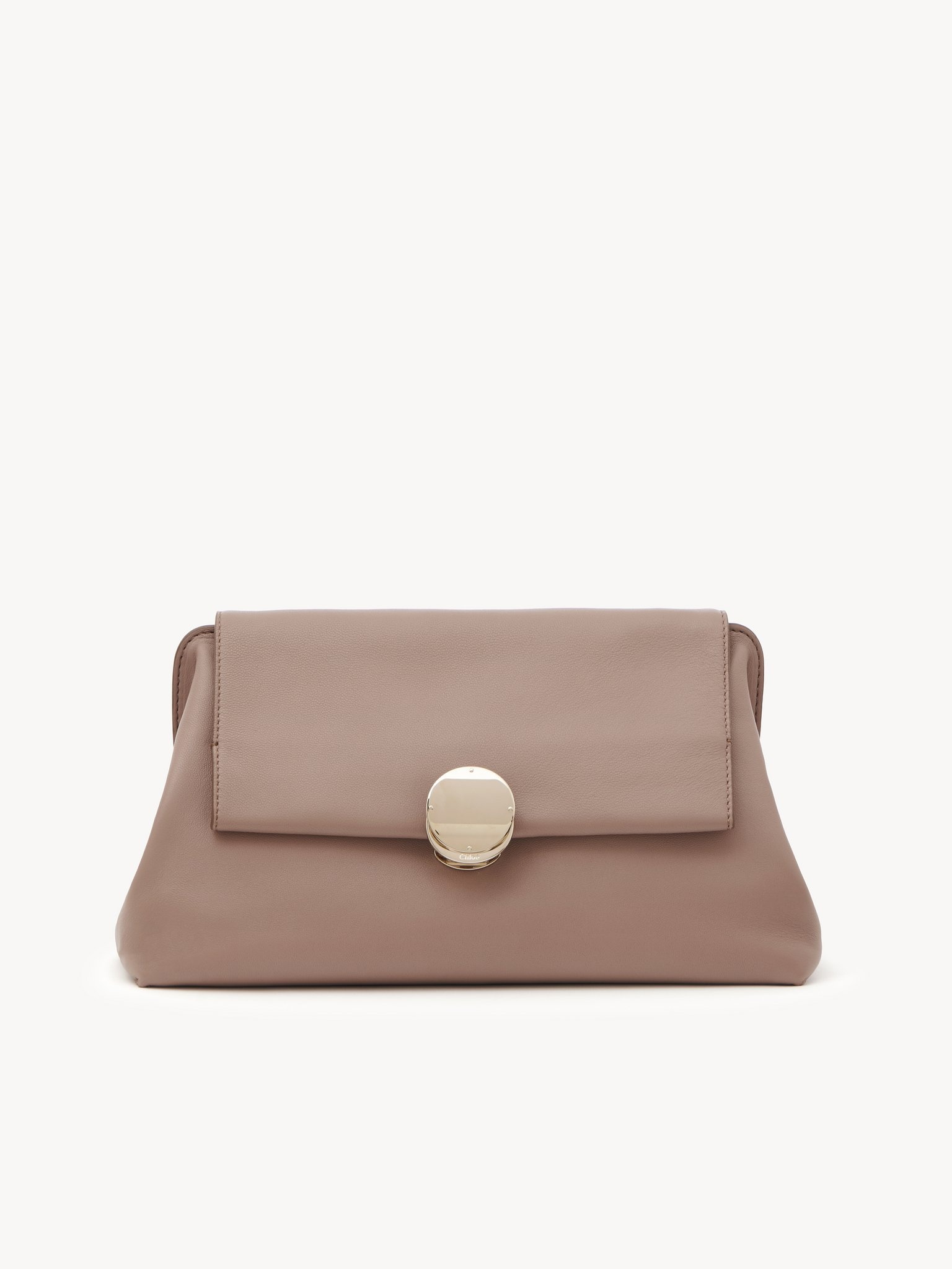 Crafted from nappa lambskin, the Penelope clutch is a roomy day-to-evening accessory with a soft silhouette. The line's signature metallic piece closes the flap, lending sophisticated detail to the slouchy yet feminine shape. A flat inside pocket rounds off the spacious main compartment. The long, adjustable strap allows for shoulder and cross-body wear in addition to hand carry. All about Penelope… In Homer's Odyssey, Penelope is a symbol of ideal femininity and loyalty. She is a free, independent woman with a strong character. Inspired by her qualities, the Penelope line matches the Chloé DNA with rounded lines, refined details and craftsmanship. Inspired by the Maison's vintage jewelry, the iconic metallic closure developed in Italy adds a signature finish. PRODUCT DETAILS Clutch in nappa lambskin Main material: Lambskin Secondary material: Calfskin Main lining: Linen Carry: hand, shoulder & cross-body - 1 spacious main compartment - 1 internal flat pocket - Long, removable & adjustable strap - Linen lining Comes with a dust bag - Width: 12.2" (31 cm) - Height: 6.1" (15.5 cm) - Depth: 5.7" (14.5 cm) - Min. strap drop: 16.1" (41 cm) - Max. strap drop: 18.1" (46 cm) This clutch is made from semi-aniline leather. The half-transparent finish imparts a robust nature to the product while preserving its natural character. Respect care instructions on the leaflet. To make this product, Chloé worked with Leather Working Group (LWG) certified leather manufacturers. LWG certifies tanneries based on their water and energy usage, management of chemicals, solid waste, and wastewater. Color: Woodrose Item code: CHC23US554J58527