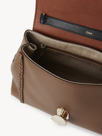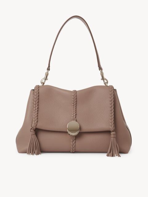 Crafted from naturally grained calfskin, this Penelope medium soft shoulder bag has a slouchy silhouette for a relaxed, feminine allure. The bag features refined details and craftsmanship rooted in the Chloé DNA, such as leather braiding, dangling tassels and contrasting hardware. This roomy day-to-evening bag has a spacious main compartment and an internal zippered pocket. The line's signature metallic piece closes the flap, echoing the hooks attaching the leather strap. Wear this large handbag casually on the shoulder. All about Penelope… In Homer's Odyssey, Penelope is a symbol of ideal femininity and loyalty. She is a free, independent woman with a strong character. Inspired by her qualities, the Penelope line matches the Chloé DNA with rounded lines, refined details and craftsmanship. Inspired by the Maison's vintage jewelry, the iconic metallic closure developed in Italy adds a signature finish. PRODUCT DETAILS Medium soft shoulder bag in grained calfskin with leather braids Main material: Bull leather Secondary material: Calfskin Main lining: Linen Flap lining: Calfskin Carry: shoulder & cross-body - Round metallic closure system - 1 spacious main compartment - 1 internal zippered pocket - Removable handle - Removable strap Comes with a dust bag - Width: 13.8" (35 cm) - Height: 9.4" (24 cm) - Depth: 5.1" (13 cm) - Handle drop: 8.7" (22 cm) - Strap drop: 19.7" (50 cm) This medium purse is made from pure aniline leather. Tanning imparts a specific character to the skin, such as hues and wrinkles, combined with a light and transparent aniline finish. Respect the care instructions on the leaflet. To make this product, Chloé worked with Leather Working Group (LWG) certified leather manufacturers. LWG certifies tanneries based on their water and energy usage, management of chemicals, solid waste, and wastewater. Color: Dark Nut Item code: CHC23US569K1529X