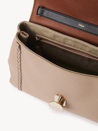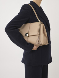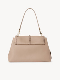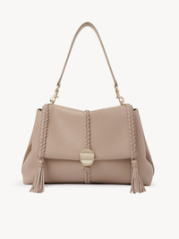 Crafted from naturally grained calfskin, this Penelope medium soft shoulder bag has a slouchy silhouette for a relaxed, feminine allure. The bag features refined details and craftsmanship rooted in the Chloé DNA, such as leather braiding, dangling tassels and contrasting hardware. This roomy day-to-evening bag has a spacious main compartment and an internal zippered pocket. The line's signature metallic piece closes the flap, echoing the hooks attaching the leather strap. Wear this large handbag casually on the shoulder. All about Penelope… In Homer's Odyssey, Penelope is a symbol of ideal femininity and loyalty. She is a free, independent woman with a strong character. Inspired by her qualities, the Penelope line matches the Chloé DNA with rounded lines, refined details and craftsmanship. Inspired by the Maison's vintage jewelry, the iconic metallic closure developed in Italy adds a signature finish. PRODUCT DETAILS Medium soft shoulder bag in grained calfskin with leather braids Main material: Bull leather Secondary material: Calfskin Main lining: Linen Flap lining: Calfskin Carry: shoulder & cross-body - Round metallic closure system - 1 spacious main compartment - 1 internal zippered pocket - Removable handle - Removable strap Comes with a dust bag - Width: 13.8" (35 cm) - Height: 9.4" (24 cm) - Depth: 5.1" (13 cm) - Handle drop: 8.7" (22 cm) - Strap drop: 19.7" (50 cm) This medium purse is made from pure aniline leather. Tanning imparts a specific character to the skin, such as hues and wrinkles, combined with a light and transparent aniline finish. Respect the care instructions on the leaflet. To make this product, Chloé worked with Leather Working Group (LWG) certified leather manufacturers. LWG certifies tanneries based on their water and energy usage, management of chemicals, solid waste, and wastewater. Color: Nomad Beige Item code: CHC23US569K1528U