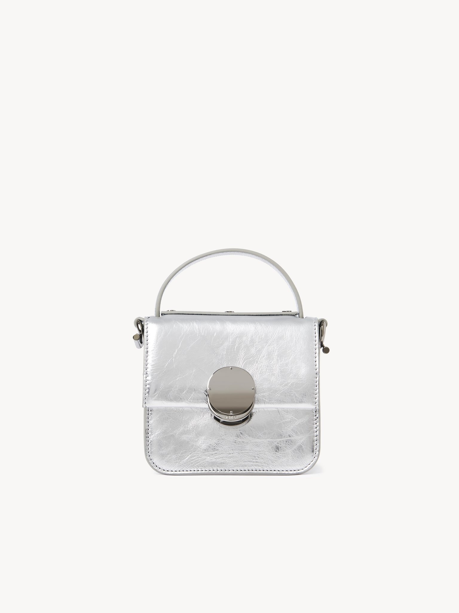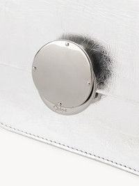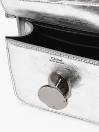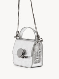Exuding a festive spirit, this Penelope micro flap bag is crafted from metallic calfskin in a micro version of the line's small top handle bag, designed to carry tiny essentials. The scaled-down shape combines a straight top line with a structured silhouette for a sleek aesthetic. Penelope's signature metallic piece closes the flap, lending sophisticated detail, while an inside flat pocket rounds off the main compartment. The chain strap and top handle allow for multiple carry options. All about Penelope… In Homer's Odyssey, Penelope is a symbol of ideal femininity and loyalty. She is a free, independent woman with a strong character. Inspired by her qualities, the Penelope line matches the Chloé DNA with rounded lines, refined details and craftsmanship. Inspired by the Maison's vintage jewelry, the iconic metallic closure developed in Italy adds a signature finish. PRODUCT DETAILS Micro flap bag in metallic calfskin Main material: Calfskin Secondary material: Calfskin Main lining: Lambskin Carry: Arm, shoulder & cross-body - 1 main compartment - 1 flat pocket - Top handle - Long removable chain strap Comes with a dust bag - Width: 6.7" (14 cm) - Height: 6.3" (13 cm) - Depth: 3.5" (6.5 cm) - Handle drop: 2" (5 cm) - Strap drop: 20.1” (51 cm) This micro bag is made from semi-aniline leather. The half-transparent finish imparts a robust nature to the product while preserving its natural character. Respect care instructions on the leaflet. To make this product, Chloé worked with Leather Working Group (LWG) certified leather manufacturers. LWG certifies tanneries based on their water and energy usage, management of chemicals, solid waste, and wastewater. Color: Silver Item code: CHC24SP423M369DL