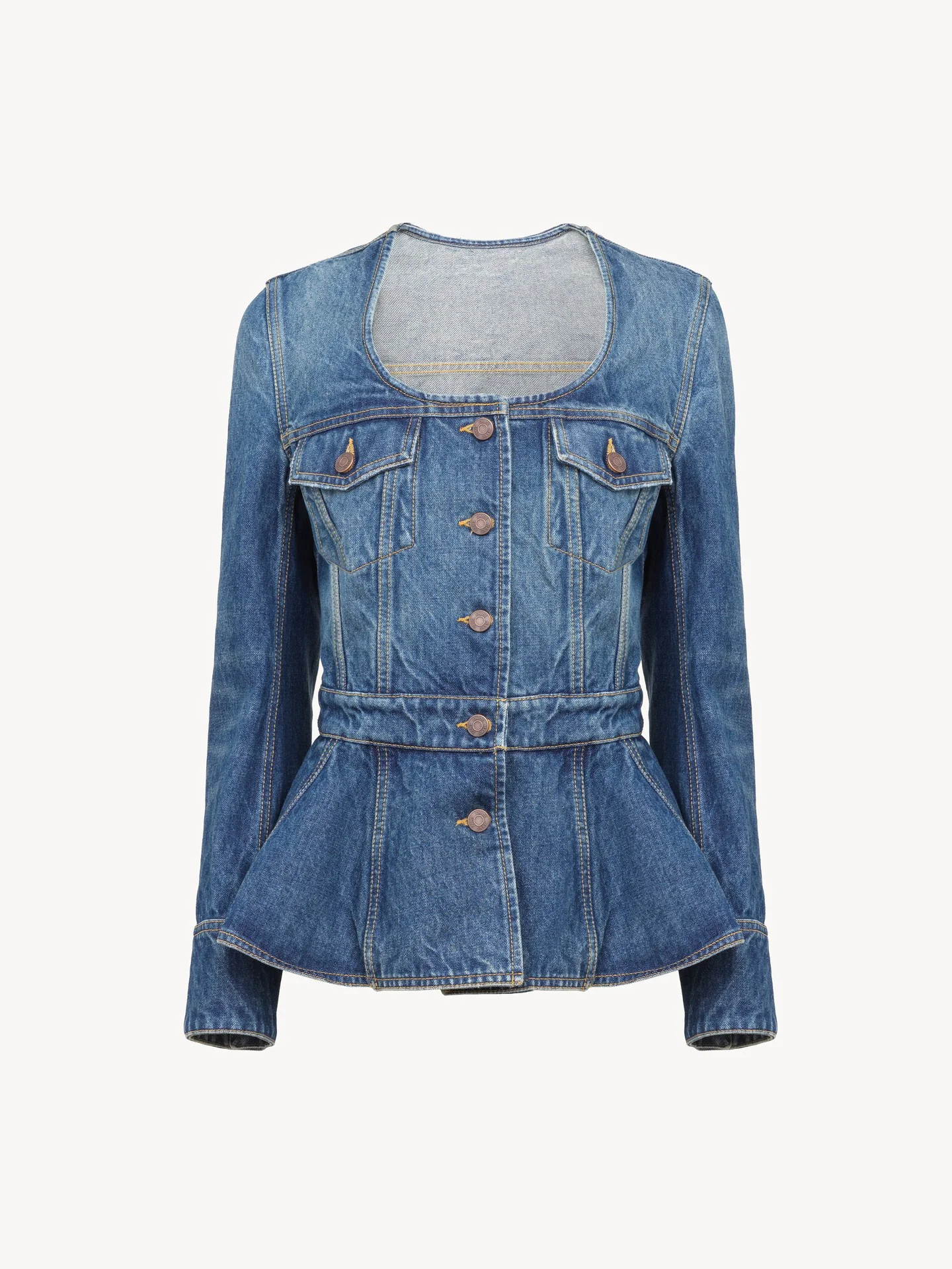 DESCRIPTION Scoop-neck peplum riding jacket in indigo wash organic cotton denim with Chloe-engraved buttons and flap chest pockets. PRODUCT DETAILS Riding jacket outer shell: 100% Cotton Fit: fit & flare - The model is 5'10" (178 cm) and wears a prototype in size 36 - Denim jacket - Chloe-engraved buttons at front, back, cuffs & pockets - Flap chest pockets An organic cotton farming system sustains the health of soils, ecosystems and people by eliminating the use of toxic and persistent organic pollutants and increasing water conservation. Color: Faded Indigo Item code: CH25WDV041534A1 CARE INSTRUCTIONS To preserve the integrity of your garment wash it at a maximum of 30°C, using a mild process to protect its delicate nature. This garment cannot withstand any bleaching agent. To maintain its shape, gently iron this garment at a maximum sole plate temperature of 110°C, taking care to avoid any harsh pressure while ironing. Entrust this garment to a specialist for mild cleaning with tetrachloroethylene and solvent F, ensuring its delicate nature is maintained with the most care. To maintain its delicate nature, do not wet clean this garment. To best preserve its form and texture, please do not tumble dry this garment. TRACEABILITY Better traceability is central to improving our materials as well as social and environmental practices. Dyeing: Italy Weaving: Italy Manufacturing : Italy