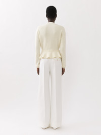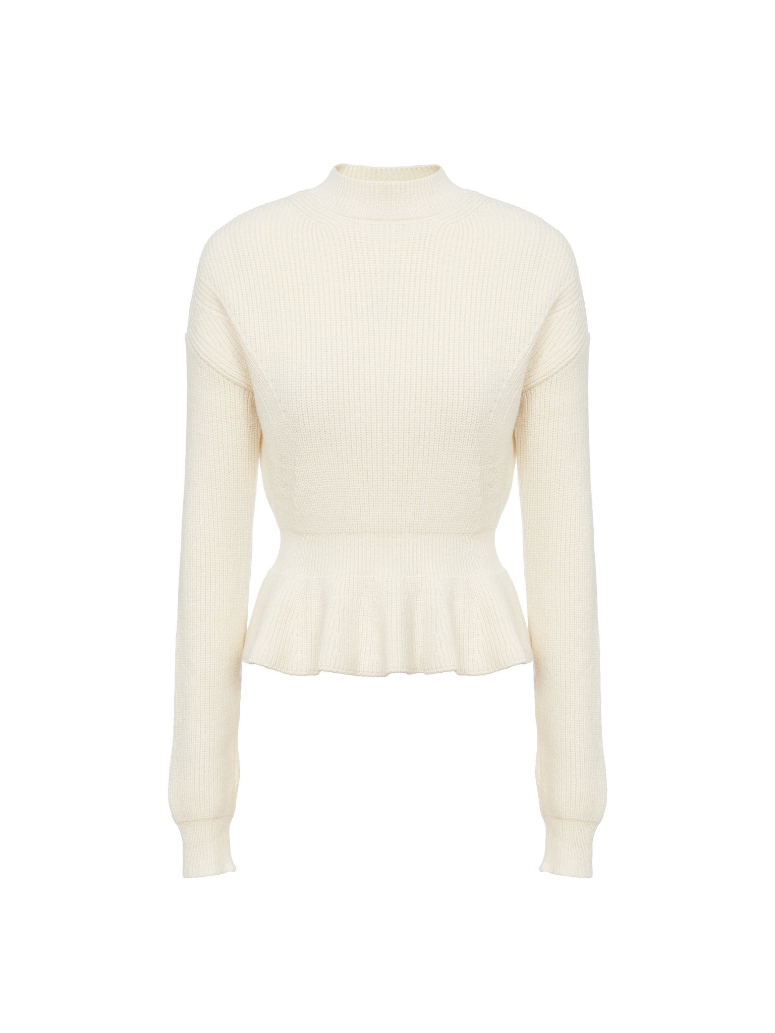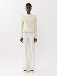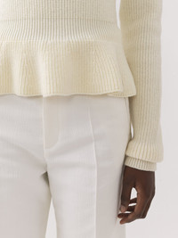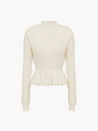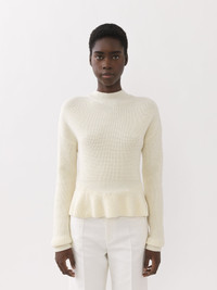 Crafted from an English wool rib knit, this peplum sweater is a mid-season piece with a sculptural silhouette, raglan sleeves and a mock neck. The flattering waist creates a feminine allure. PRODUCT DETAILS Peplum sweater main material: 100% Wool Care: dry clean only Fit: peplum - The model is 5’10” (178 cm) and wears a prototype in size S - Knit sweater - Slips on Color: Iconic Milk Item code: CHC23AMP15630107