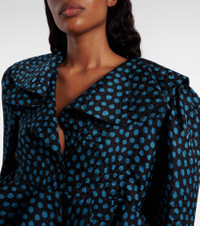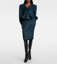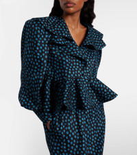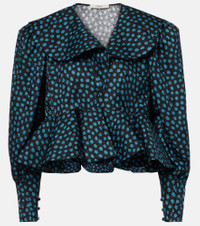 Renowned for its free-spirited aesthetic, Chloe's designs are characterized by romance with a Parisian flair. Made from lustrous silk jacquard, this peplum top is complete with a polka dot pattern and delicate ruffles at the neckline. Product Details - Material: 100% silk - Care instructions: dry clean - Made in Italy - Color: black - Designer color name: Black - Blue 1 - Item color: black, blue - Lining: 76% acetate, 24% silk - Closure: partially buttoned front - Cuff: buttoned - Item number: P01130783 Size & Fit - True to size - Shoulder pad inserts - Cinched waist - Non-stretchy fabric - Slightly cropped - Height of model is 174cm-68.5" and wears a size FR 36