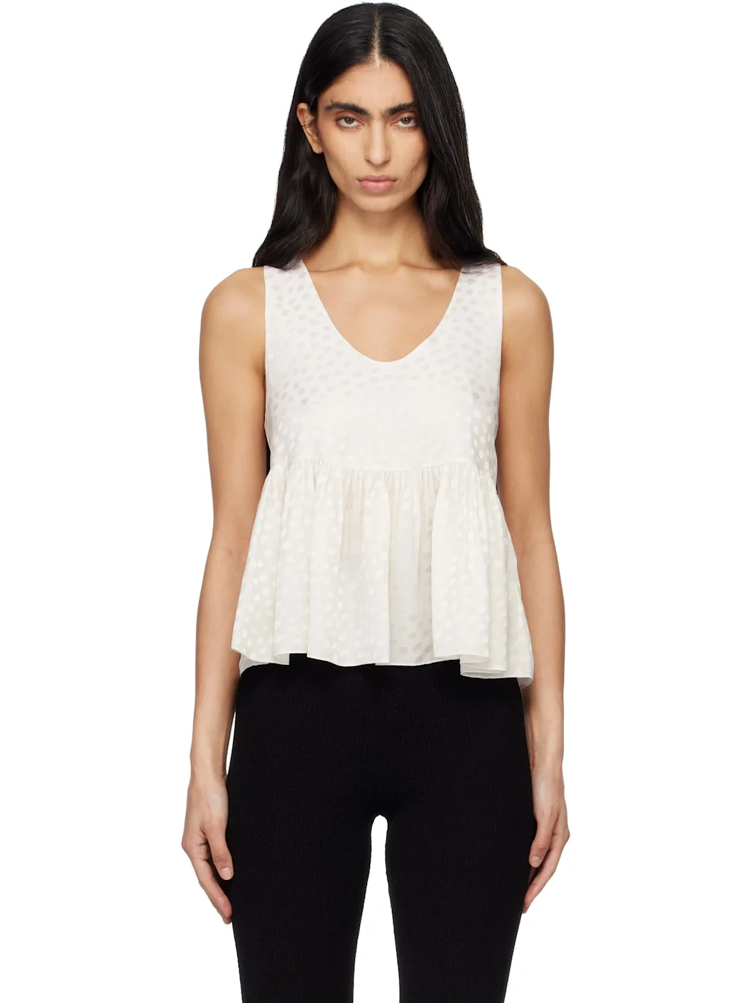 Silk crepe satin tank top. · Dot pattern throughout · Scoop neck · Peplum hem Supplier color: Iconic Milk Body 1: 100% silk. Body 2: 76% acetate fiber, 24% silk. Made in Madagascar 261338F111000