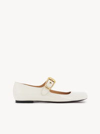Crafted from patent calfskin, the Polly ballerina is a daring reinterpretation of the classic ballet style. The modern silhouette pairs clean lines with an asymmetrical toe shape while an oversized Chloe-engraved gold buckle secures the front strap. PRODUCT DETAILS Flat ballerina Upper: calfskin Inner sole: goatskin Main lining: goatskin Sole: cowhide Fit true to size, European sizing - Buckle fastening To make this product, Chloe worked with Leather Working Group (LWG) certified leather manufacturers. LWG certifies tanneries based on their water and energy usage, management of chemicals, solid waste, and wastewater. Color: Eggshell Item code: CHC24W07BOR122