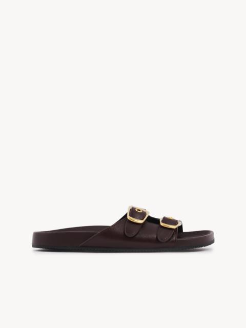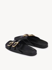 Crafted from shiny calfskin, these Polly slides pair an anatomically designed rubber footbed with an asymmetrical toe shape. This contemporary style is finished with adjustable double straps secured by exaggerated Chloe-engraved gold buckles. PRODUCT DETAILS Slide heel height: 1" (2.5 cm) Heel-to-toe drop: 0.2" (0.5 cm) Upper: calfskin Inner sole: sheepskin Main lining: sheepskin Sole: thermoplastic polyurethane Fit true to size, European sizing - Slip-on To make this product, Chloe worked with Leather Working Group (LWG) certified leather manufacturers. LWG certifies tanneries based on their water and energy usage, management of chemicals, solid waste, and wastewater. Color: Black Item code: CHC25S08PQJ001