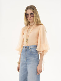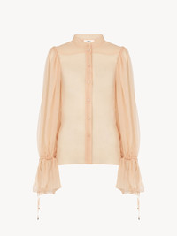 Sheer puff-sleeve blouse in organic silk mousseline with a silk lining, detailed with mother-of-pearl buttons and gathered cuffs. Dangling ties with gold-tone metal tips finish this piece. PRODUCT DETAILS Puff-sleeve blouse outer shell: 100% Silk Lining: 100% Silk Buttons: 100% Mother-of-pearl Fit: fluid - The model is 5'10" (178 cm) and wears a prototype in size 36 - Sheer silk blouse - Mother-of-pearl buttons through front - Cuff ties with metal tips Care: dry cleaning only Organic silk manufacturing restricts the use of pesticides, insecticides or harsh chemicals and incorporates methods that respect biodiversity, improve soil quality and reduce water consumption. Color: Clay Pink Item code: CH25UHT501166H9