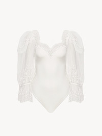 Fitted bodysuit in shiny stretch jersey, featuring sheer puff sleeves and a lace trim rooted in the Maison's heritage. Dangling ties are finished with gold-tone metal tips. PRODUCT DETAILS Bodysuit outer shell: 100% Polyamide Lining: 68% Acetate fiber, 32% Silk Fit: fitted - The model is 5'10" (178 cm) and wears a prototype in size 36 - Lace-trimmed bodysuit - Ties with hammered metal tips Care: dry cleaning only Color: Coconut Milk Item code: CH25UBD01472103