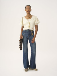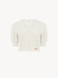 V-neck cardigan in a lower-impact chunky wool and cashmere knit, featuring short puff sleeves, fabric-covered buttons and Chloe logo embroidery at the hem. PRODUCT DETAILS Cardigan outer shell: 70% Wool, 30% Cashmere wool Fit: straight - The model is 5'10" (178 cm) and wears a prototype in size S - Puff-sleeve cardigan - Fabric-covered buttons through front The wool used in this product comes from a farm that respects animal welfare, maintains soil health, protects biodiversity and promotes native species. Color: Iconic Milk Item code: CH25WMC05590107
