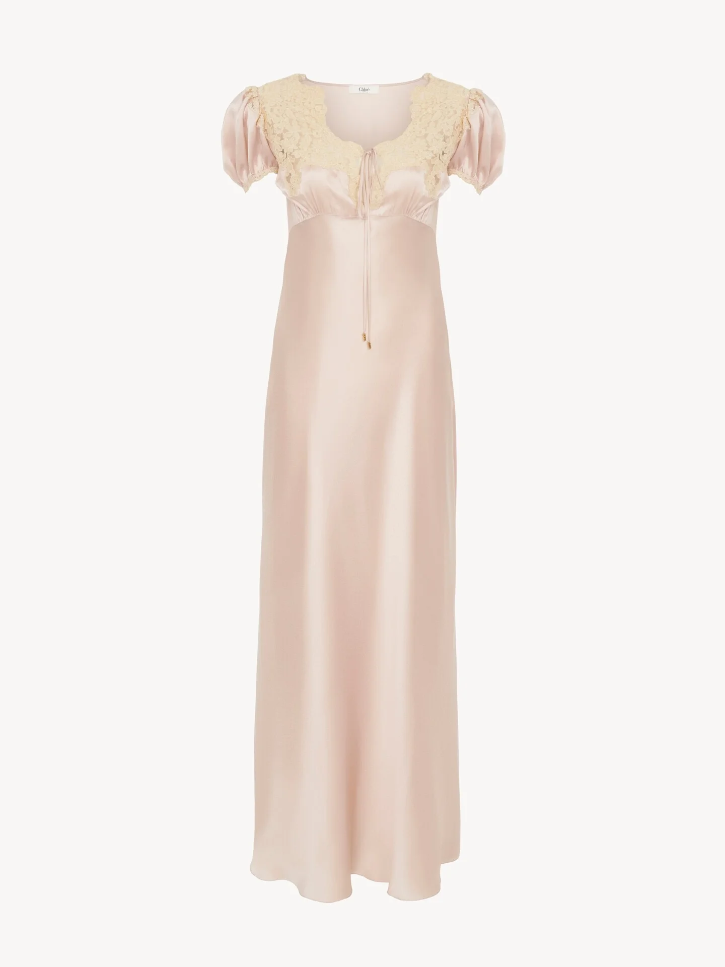 DESCRIPTION Puff-sleeve column dress in washed silk satin with lace inserts, featuring dangling ties with gold-tone metal tips. PRODUCT DETAILS Column dress outer shell: 100% Silk Main lacework: 90% Polyester, 8% Viscose, 2% Polyamide Sleeve embellishment: 100% Polyester Fit: fluid, long - The model is 5'10" (178 cm) and wears a prototype in size 36 - Long silk dress - Dangling ties with hammered metal tips This product was made in collaboration with Akanjo, a certified WFTO supplier. Akanjo is a social enterprise located in Madagascar that places equal pay and employees' health & wellbeing at the core of their priorities. A long-standing partner of Chloe for 15 years, Akanjo is also committed to training and promoting craftsmanship. Color: Rose Dust Item code: CH25WRO010086K7 CARE INSTRUCTIONS To preserve the integrity of your garment, please refrain from washing, entrusting its care to professional cleaning services for optimal maintenance. This garment cannot withstand any bleaching agent. To maintain its shape, gently iron this garment at a maximum sole plate temperature of 110°C, taking care to avoid any harsh pressure while ironing. Entrust this garment to a specialist for mild cleaning with tetrachloroethylene and solvent F, ensuring its delicate nature is maintained with the most care. To maintain its delicate nature, do not wet clean this garment. To best preserve its form and texture, please do not tumble dry this garment. TRACEABILITY Better traceability is central to improving our materials as well as social and environmental practices. Dyeing: Italy Finishing: Italy Weaving: China