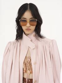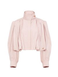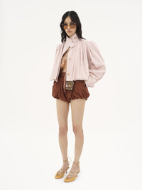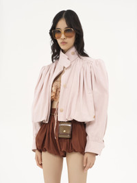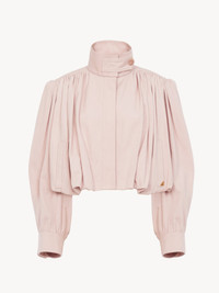 Gathered boule jacket in cotton canvas with a high neck, gathered shoulders and pleated sleeves. Engraved horn buttons and a gold metal Chloe logo triangle at the left pocket finish this piece. PRODUCT DETAILS Gathered boule jacket outer shell: 100% Cotton Lining: 100% Cotton Buttons: 100% Horn Fit: straight - The model is 5'10" (178 cm) and wears a prototype in size 36 - Pleated-sleeve jacket - Engraved horn buttons through front, at collar & cuffs - Side pockets - Gold metal Chloe logo triangle at left pocket Care: dry cleaning only Color: Peach Blush Item code: CH25UVE190026E8