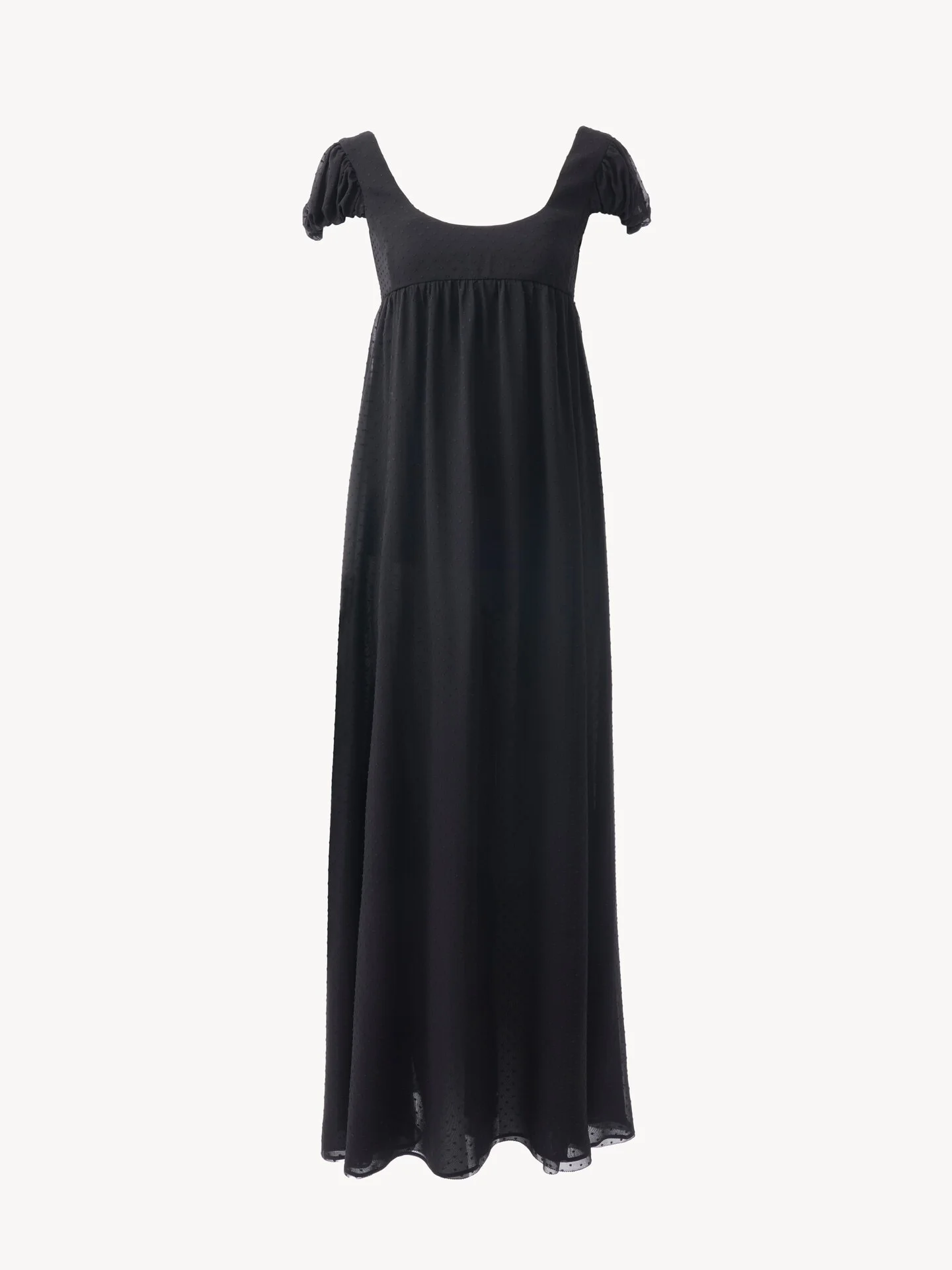 DESCRIPTION Puff-sleeve long dress in light silk plumetis with a silk-mix lining, combining a scoop-neck top with a fluid skirt gathered at the chest. PRODUCT DETAILS Puff-sleeve long dress outer shell: 100% Silk Lining: 68% Acetate fiber, 32% Silk Fit: fluid, long - The model is 5'10" (178 cm) and wears a prototype in size 33/34 - Short-sleeve dress - Back zipper Color: Black Item code: CH25ARO21977001 CARE INSTRUCTIONS To preserve the integrity of your garment, please refrain from washing, entrusting its care to professional cleaning services for optimal maintenance. This garment cannot withstand any bleaching agent. To maintain its shape, gently iron this garment at a maximum sole plate temperature of 110°C, taking care to avoid any harsh pressure while ironing. Entrust this garment to a specialist for mild cleaning with tetrachloroethylene and solvent F, ensuring its delicate nature is maintained with the most care. To maintain its delicate nature, do not wet clean this garment. To best preserve its form and texture, please do not tumble dry this garment. TRACEABILITY Better traceability is central to improving our materials as well as social and environmental practices. Dyeing: Italy Finishing: Italy Weaving: Italy