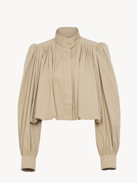 Gathered boule jacket in light organic cotton gabardine with a high collar, gathered shoulders and pleated sleeves. Engraved horn buttons finish this piece. PRODUCT DETAILS Gathered boule jacket outer shell: 100% Cotton Lining: 100% Cotton Buttons: 100% Horn Fit: straight - The model is 5'10" (178 cm) and wears a prototype in size 36 - Pleated-sleeve jacket - Engraved horn buttons through front, at collar & cuffs - Side pockets Care: dry cleaning only An organic cotton farming system sustains the health of soils, ecosystems and people by eliminating the use of toxic and persistent organic pollutants and increasing water conservation. Color: Smoky Beige Item code: CH25UVE2111823I