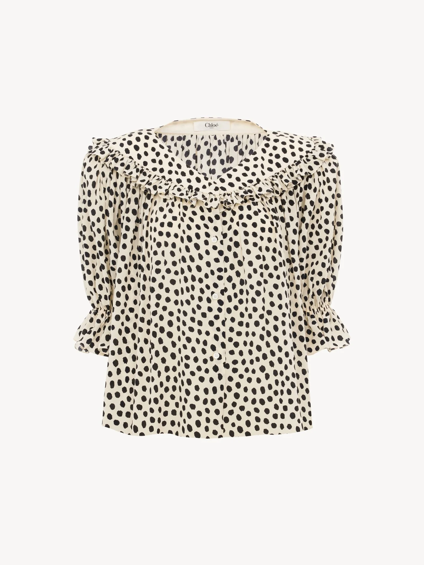 DESCRIPTION Puff-sleeve ruffle top in organic silk crepe de chine with a dots print, featuring elbow-length sleeves and mother-of-pearl buttons. PRODUCT DETAILS Ruffle top outer shell: 100% Silk Main lining: 76% Acetate fiber, 24% Silk Buttons: 100% Mother-of-pearl Fit: fluid - The model is 5'10" (178 cm) and wears a prototype in size 36 - Puff-sleeve silk top - Mother-of-pearl buttons through front Organic silk manufacturing restricts the use of pesticides, insecticides or harsh chemicals and incorporates methods that respect biodiversity, improve soil quality and reduce water consumption. Color: Beige Item code: CH26SHT6530694Q CARE INSTRUCTIONS To preserve the integrity of your garment, please refrain from washing, entrusting its care to professional cleaning services for optimal maintenance. This garment cannot withstand any bleaching agent. To maintain its shape, gently iron this garment at a maximum sole plate temperature of 110°C, taking care to avoid any harsh pressure while ironing. Entrust this garment to a specialist for mild cleaning with tetrachloroethylene and solvent F, ensuring its delicate nature is maintained with the most care. To best preserve its form and texture, please do not tumble dry this garment. To maintain its delicate nature, do not wet clean this garment. TRACEABILITY Better traceability is central to improving our materials as well as social and environmental practices. Finishing: Italy Weaving: China
