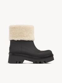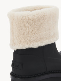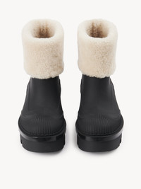 This Raina ankle boot updates the Maison's distinctive rain boot with a shearling collar for a cozy winter attitude. The slip-on boot is made from bio-based TPU eco-designed in partnership with ACBC – a leader in applied sustainability. The mid-calf ankle boot has a rounded toe shape and a lightweight lugged sole that recalls the Owena line. Mini scallops detail the welt for a romantic twist to the boyish silhouette, while the Chloé logo signs the heel. Matching a cool attitude with comfort, this ankle boot is the perfect companion for cooler weather. PRODUCT DETAILS Ankle boot heel height: 2.2" (5.5 cm) Heel-to-toe drop: 0.8” (2 cm) - Inner sole: 60% polyurethane, 40% lamb shearling - Upper 1: thermoplastic polyurethane - Upper 2: lamb shearling - Main lining: polyester - Secondary lining: lamb shearling - Sole: thermoplastic polyurethane Fit true to size, European sizing - Slip-on ankle boot Chloé has partnered with ACBC, a product development expert specialized in sustainability consultancy, to help improve the Maison's material selection. The result of this cooperation is the launch of the new Raina rainboot in bio-based TPU. The use of this material enables the reduction of greenhouse gas emissions, water usage, and the product's overall weight. Color: Black Item code: CHC24S00OHK001