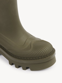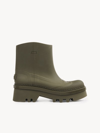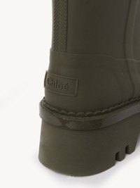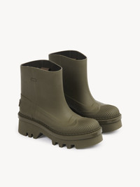 A key piece in the Fall-Winter 2023 collection, this Raina rain boot is made from bio-based TPU eco-designed in partnership with ACBC – a leader in applied sustainability. The slip-on, mid-calf bootie has a rounded toe shape and a lightweight lugged sole that recalls the Owena line. Mini scallops detail the welt for a romantic twist to the boyish silhouette, while the Chloé logo signs the heel. Matching a cool attitude with comfort, this rain boot is suited to fall and summer weather, paired with flared pants and mid-length skirts alike. PRODUCT DETAILS Rain boot heel height: 2.2" (5.5 cm) Heel-to-toe drop: 0.8” (2 cm) Inner sole: 40% polyethylene-terephthalate, 60% polyurethane Upper: 37% bio TPU, 63% TPU & polyamide Lining: 100% polyethylene-terephthalate Sole: bio-based TPU Fit true to size, European sizing - Slip-on rain boot Chloé has partnered with ACBC, a product development expert specialized in sustainability consultancy, to help improve the Maison's material selection. The result of this cooperation is the launch of the new Raina rain boot in bio-based TPU. The use of this material enables the reduction of greenhouse gas emissions, water usage, and the product's overall weight. Color: Grape Leaf Item code: CHC23A904FP3E4