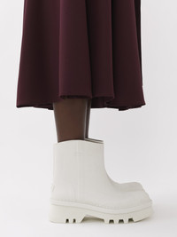 A key piece in the Fall-Winter 2023 collection, this Raina rain boot is made from bio-based TPU eco-designed in partnership with ACBC – a leader in applied sustainability. The slip-on, mid-calf bootie has a rounded toe shape and a lightweight lugged sole that recalls the Owena line. Mini scallops detail the welt for a romantic twist to the boyish silhouette, while the Chloé logo signs the heel. Matching a cool attitude with comfort, this rain boot is suited to fall and summer weather, paired with flared pants and mid-length skirts alike. PRODUCT DETAILS Rain boot heel height: 2.2" (5.5 cm) Heel-to-toe drop: 0.8” (2 cm) Inner sole: 40% polyethylene-terephthalate, 60% polyurethane Upper: 37% bio TPU, 63% TPU & polyamide Lining: 100% polyethylene-terephthalate Sole: bio-based TPU Fit true to size, European sizing - Slip-on rain boot Chloé has partnered with ACBC, a product development expert specialized in sustainability consultancy, to help improve the Maison's material selection. The result of this cooperation is the launch of the new Raina rain boot in bio-based TPU. The use of this material enables the reduction of greenhouse gas emissions, water usage, and the product's overall weight. Color: White Item code: CHC23A904FP101