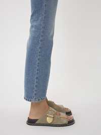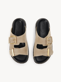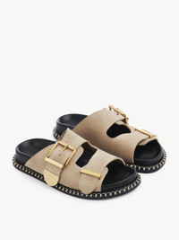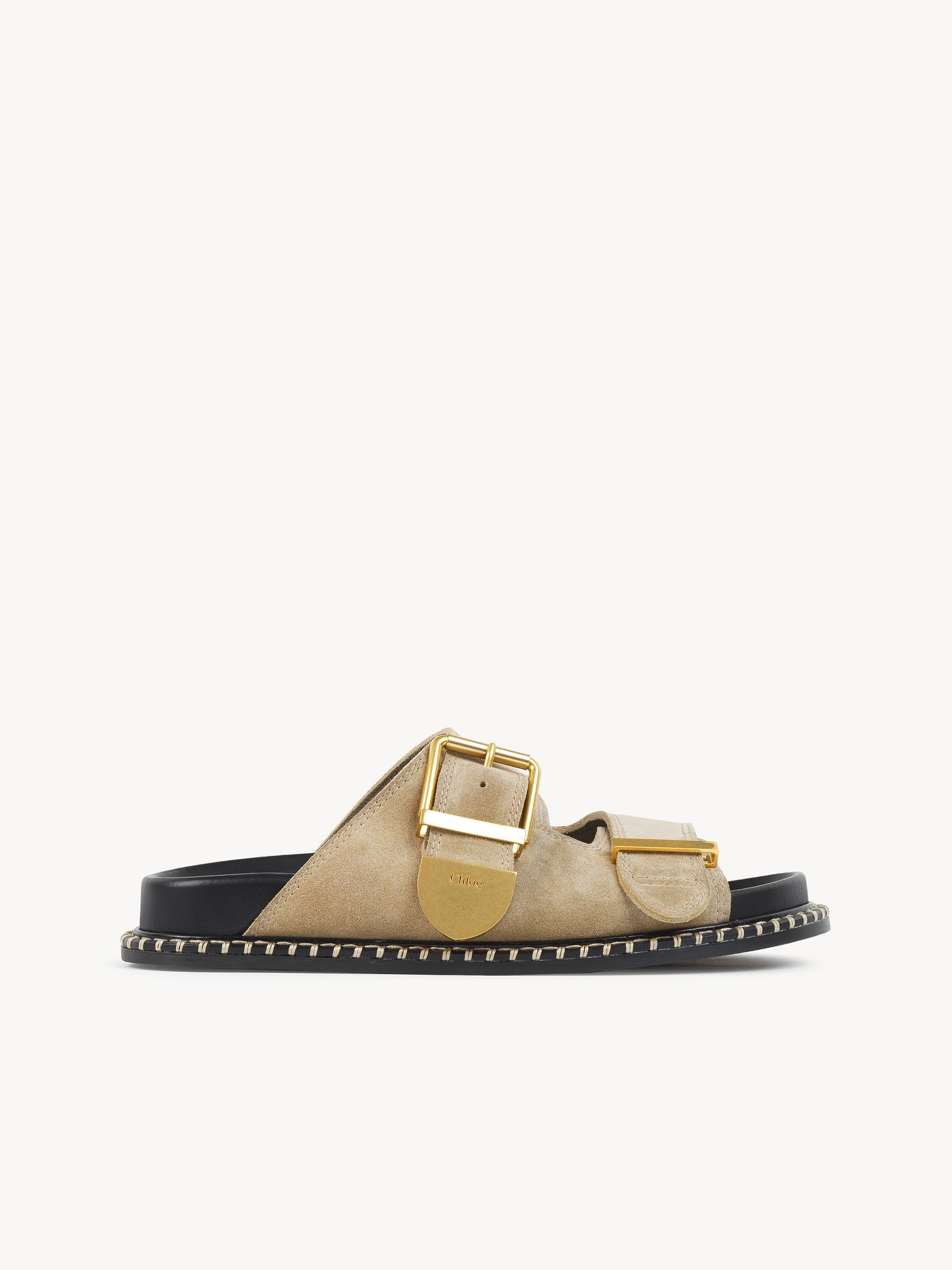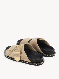 Crafted from suede calfskin for an elegant mix of textures and colors, this Rebecca slide is a comfortable flat sandal. The line's signature oversized buckle adorns the lower strap, elevating the slip-on silhouette with gold-toned hardware. The anatomically designed rubber footbed ensures day-long comfort, while exaggerated contrast stitches detail the welt. Chloé-engraved gold brass tips add the Maison's refined signature. At once relaxed and sophisticated, this versatile slide will add a casual touch to any look. PRODUCT DETAILS Flat slide - Inner sole: lambskin - Main lining: suede calfskin - Sole: 75% thermoplastic polyurethane, 5% polyester - Upper: suede calfskin Fit true to size, European sizing - Mule sandal - Buckled straps To make this product, Chloé worked with Leather Working Group (LWG) certified leather manufacturers. LWG certifies tanneries based on their water and energy usage, management of chemicals, solid waste, and wastewater. Color: Dark Greige Item code: CHC24S981F621V